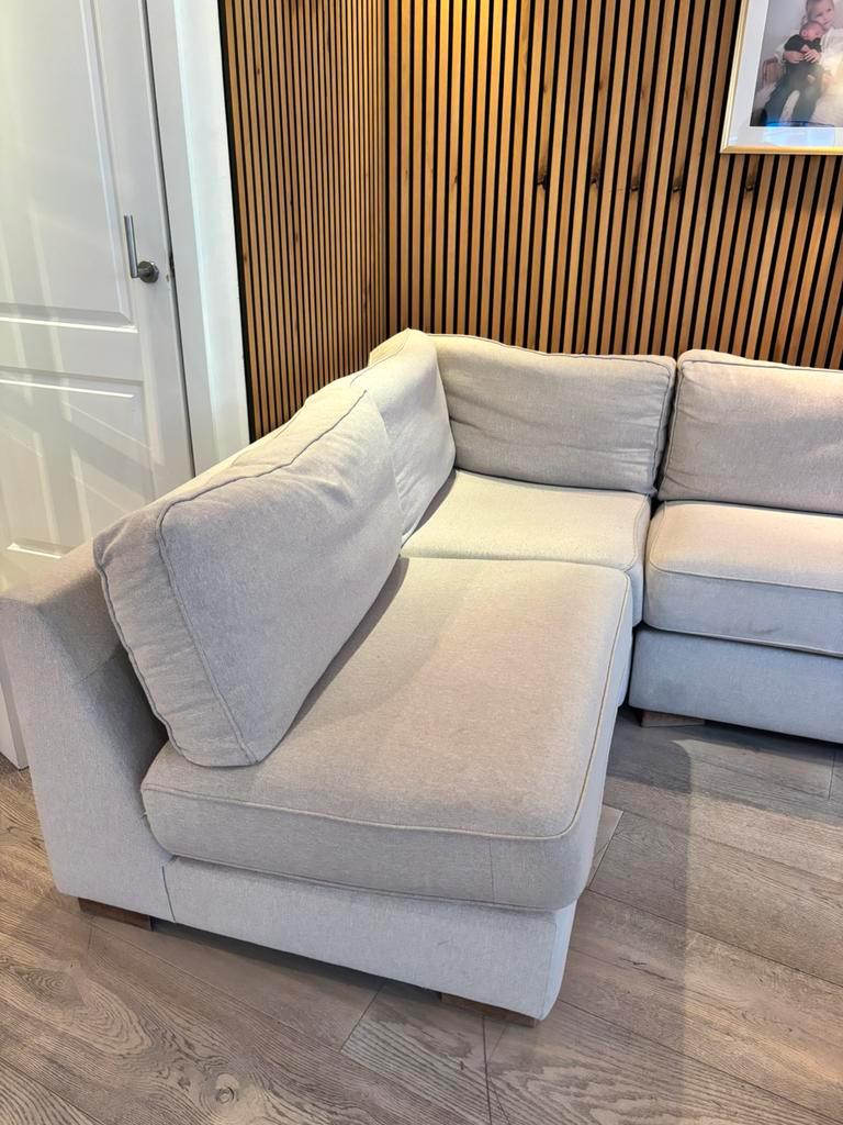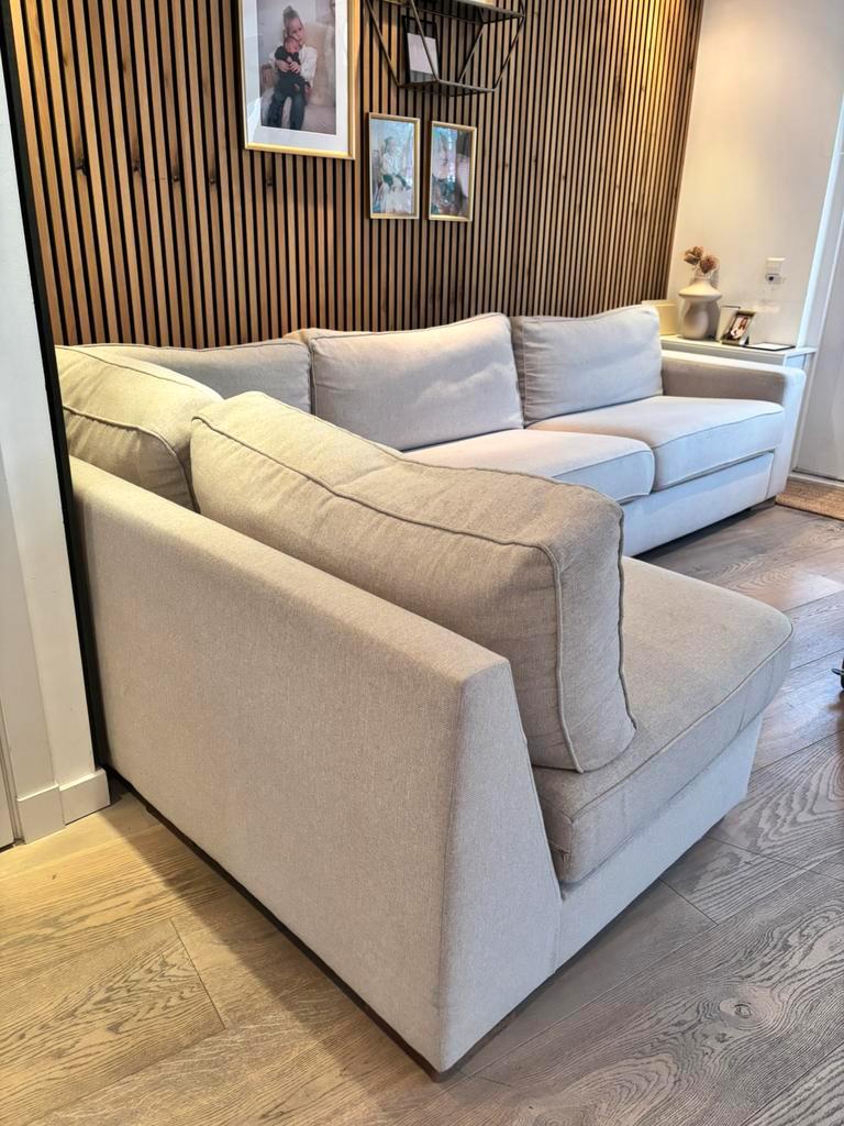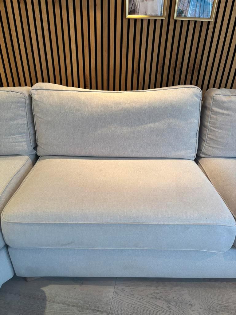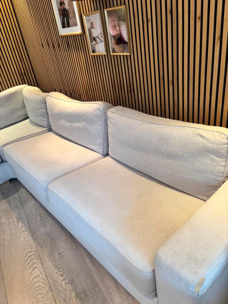 De maten van de hoekbank zijn 317 cm x 183 cm en 90 cm diep. Zithoogte 50. Heeft op de hoek een beschadiging (zie foto) en wat vlekken hier en daar, maar die zijn wel weg te poetsen! Gratis af te hale