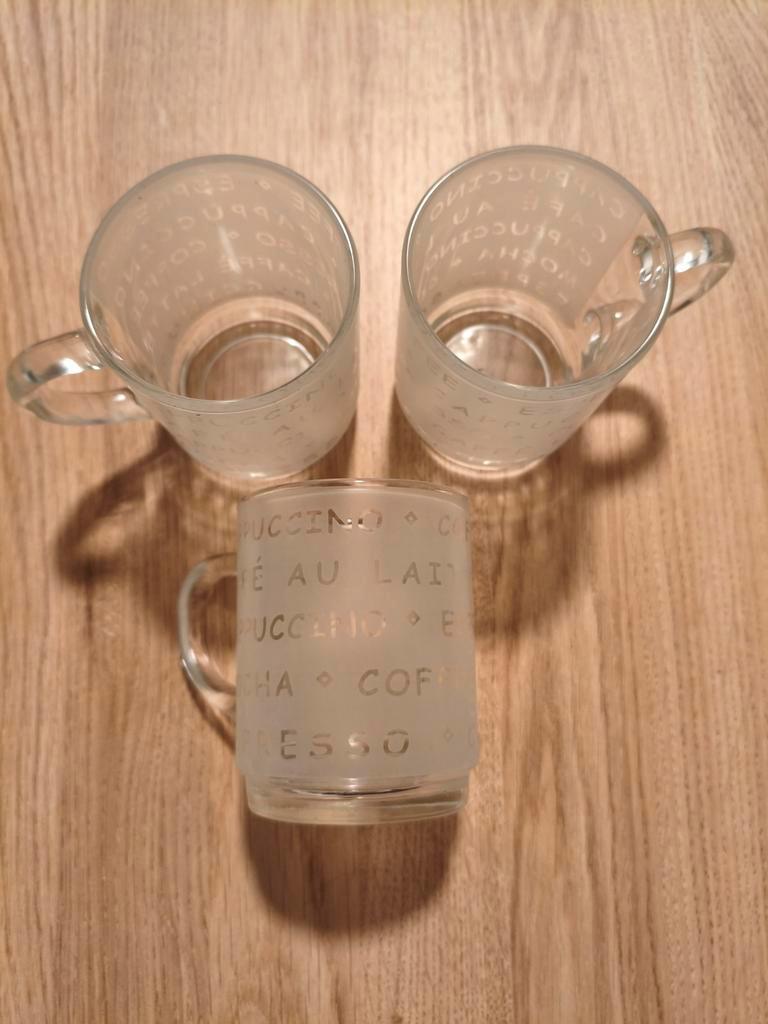 Set van 3 glazen, geschikt voor koffie of thee. De glazen zijn bedrukt met diverse koffiesoorten.