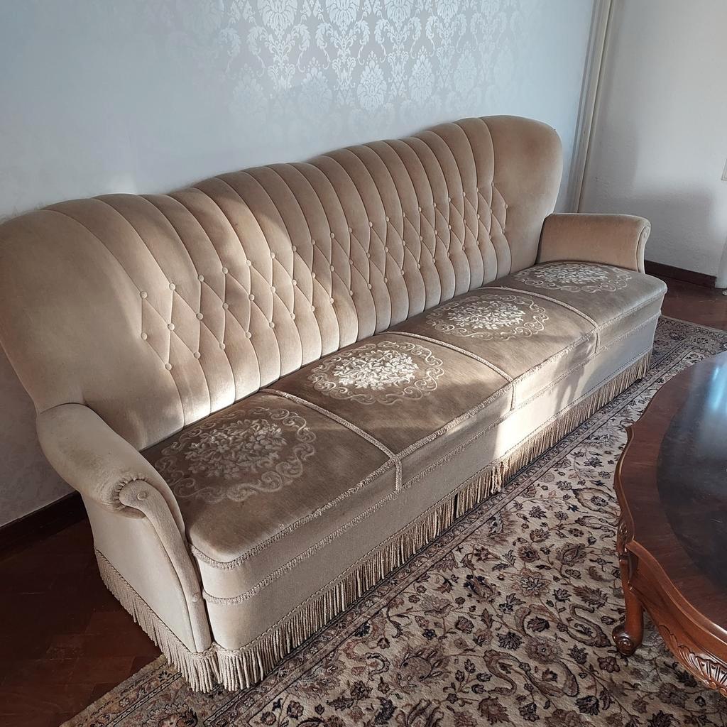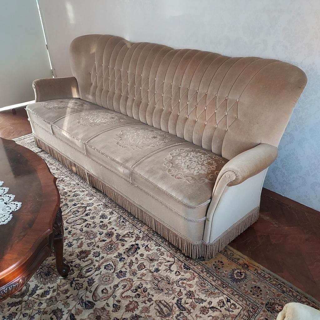 Comfortabele vierpersoons bank met een klassieke en elegante uitstraling. De bank is bekleed met een zachte stof en heeft een sierlijke afwerking. De bank is al aan aantal jaren oud dus niet nieuw en