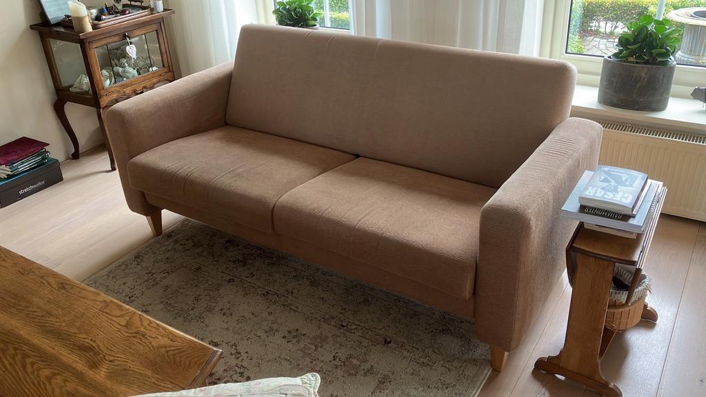 Bankstel met 2 fauteuils kleur bruin bank is 180 cm breed en diep 80 cm de fauteuils zijn 70 cm breed en diep 75 cm op 1 kussen zitten kleine vlekjes