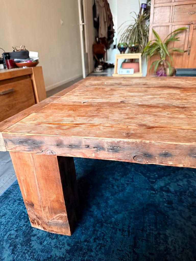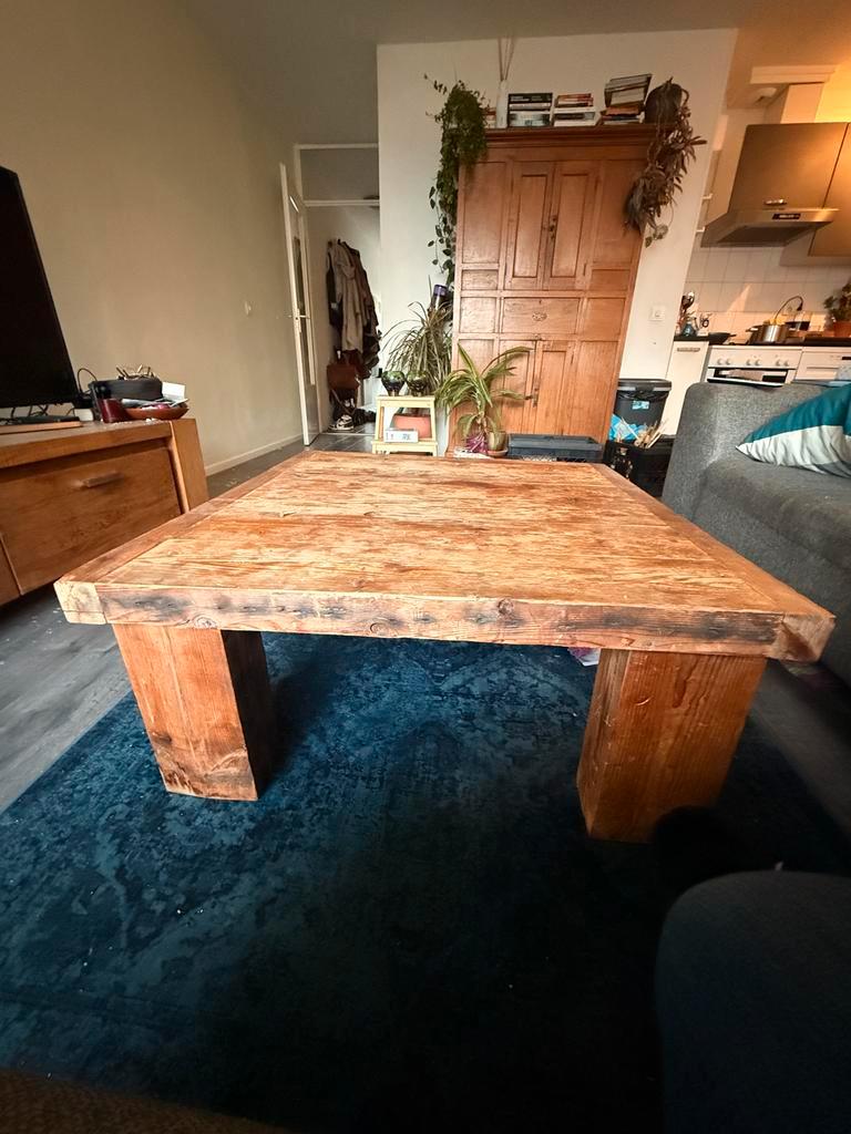 Mooie houten salontafel. Gebruikt, maar in goede staat en kan zeker nog een ronde mee. Stevig en stabiel. Ideaal voor een landelijk of vintage interieur. 90 Bij 90 cm breed, 40 cm hoog.
