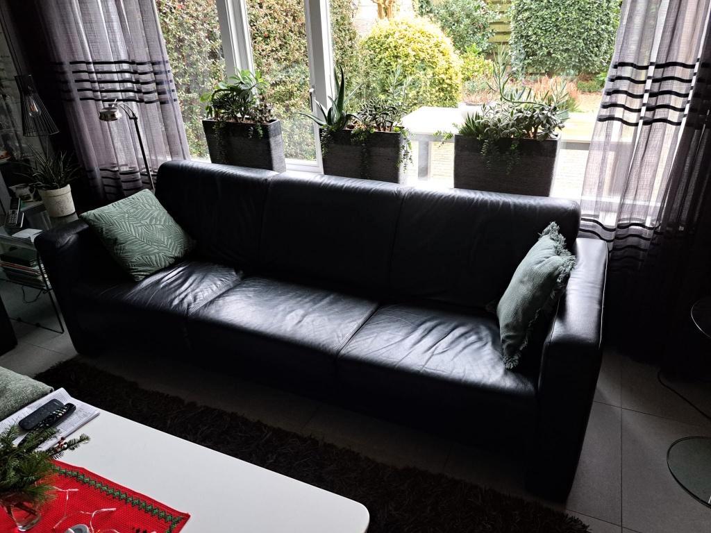 Een nog in prima staat verkerende zwart lederen bank. 2.40 Breed! Voor 3 tot 4 personen. Afhalen in wijk bij duurstede laatste kans, gaat volgende week naar de stort.