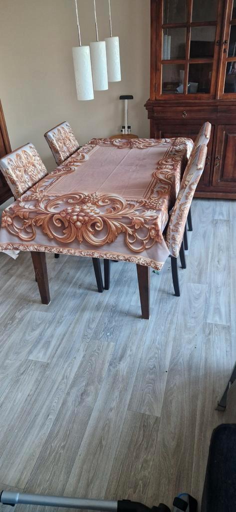 Mooie eettafel met 4 bijpassende stoelen inclusief beschermhoezen. De set is in goede staat en klaar voor gebruik. Ideaal voor een gezellig diner met familie of vrienden. De tafel is stevig en de stoe