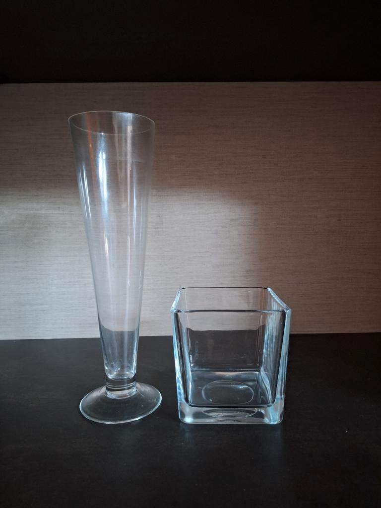 Set van twee kleine vaasjes. Een vaasje is hoog en smal, de andere is vierkant. Beide zijn gemaakt van helder glas en in goede staat.
