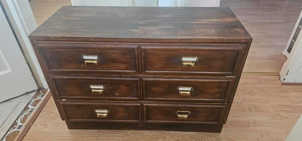 Gratis antiek look lade kast dressoir stevige kwaliteit. Voorzien van antiek look met craquele patina in verschillende bruin tinten. En mooie koperkleur handgrepen met naamkaartjes venster. Met 3 lade