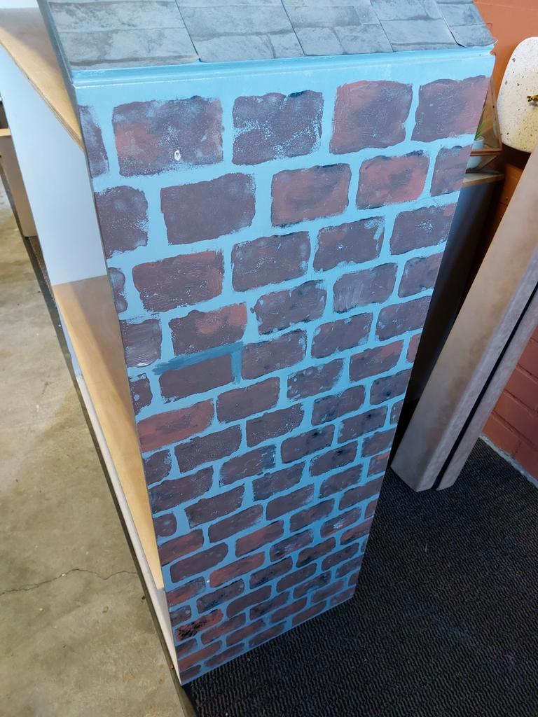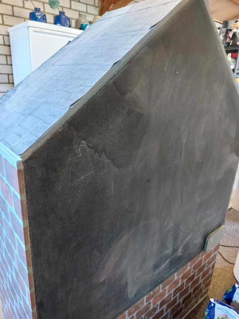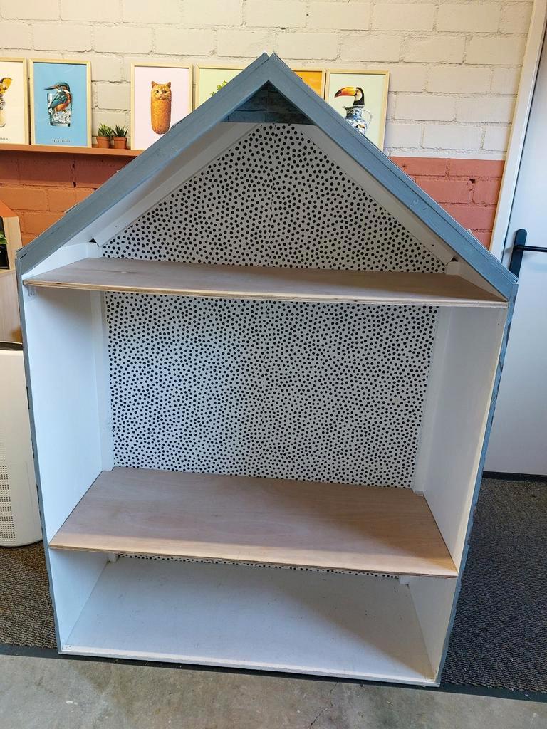 Kast in de vorm van een huisje met 2 planken. Planken kunnen er ook uit zodat er een leeshoek van gemaakt kan worden od een tafel in gezet kan worden. De afmetingen zijn: 108 cm breed, 150 cm hoog, 43