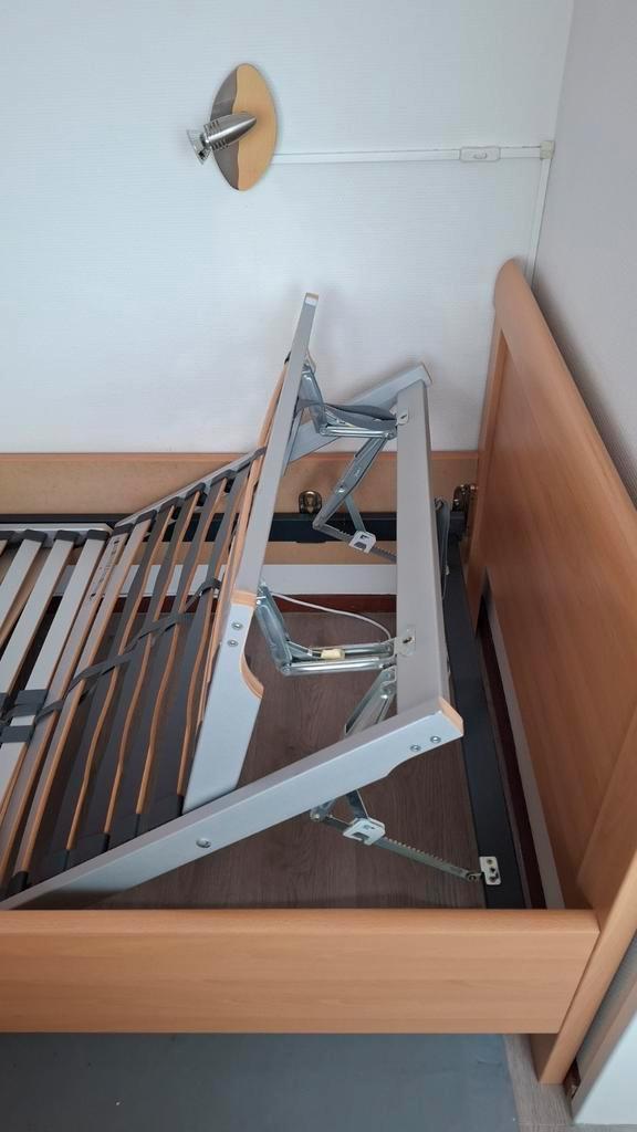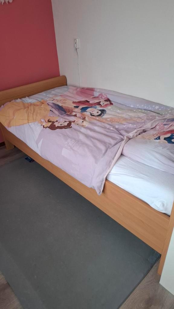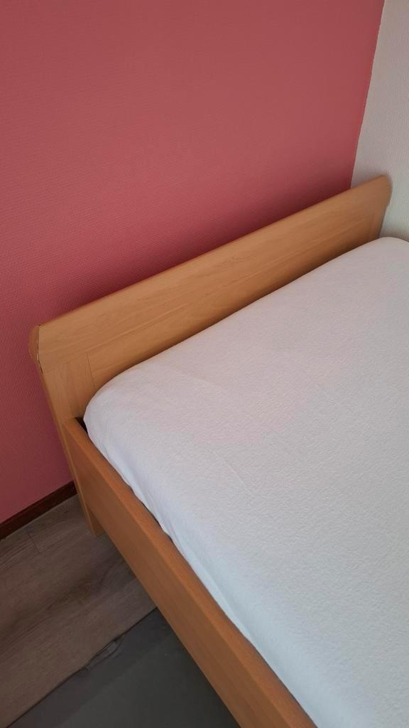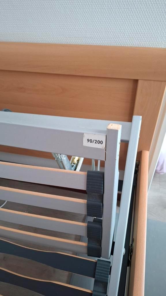 Eenpersoonsbed van beukenhout (90x200 cm) met handmatig verstelbare lattenbodem. Inclusief matras, matrasbeschermer en bijpassend wandlampje. Exclusief beddengoed op foto nr. 2. Gratis afhalen vanaf z