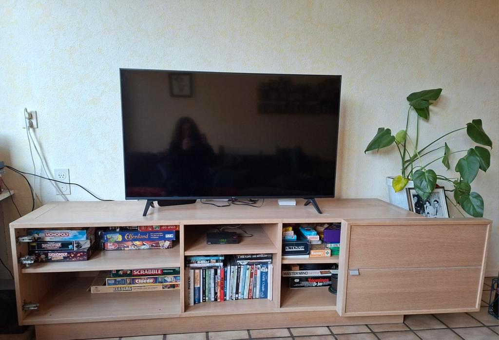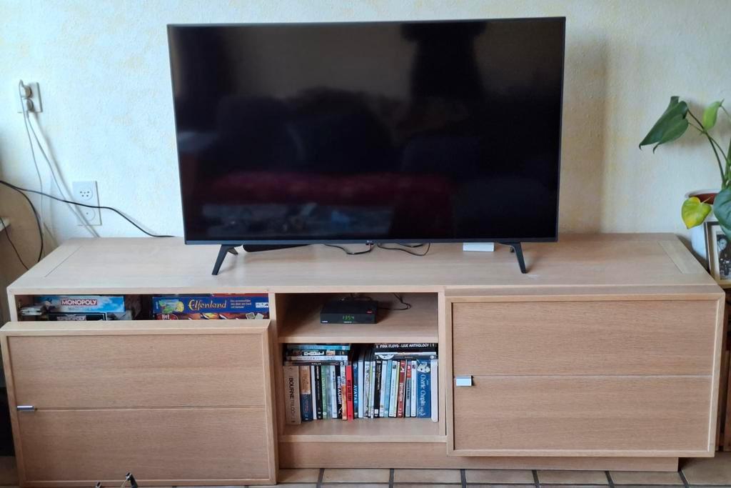 Gebruikte tv meubel/kast van hout. Het hout is nog in goede staat. De deurtjes moeten wel weer steviger bevestigd worden, 1 deurtje heeft wat aandacht nodig qua bevestigen. Verder een prima meubel voo
