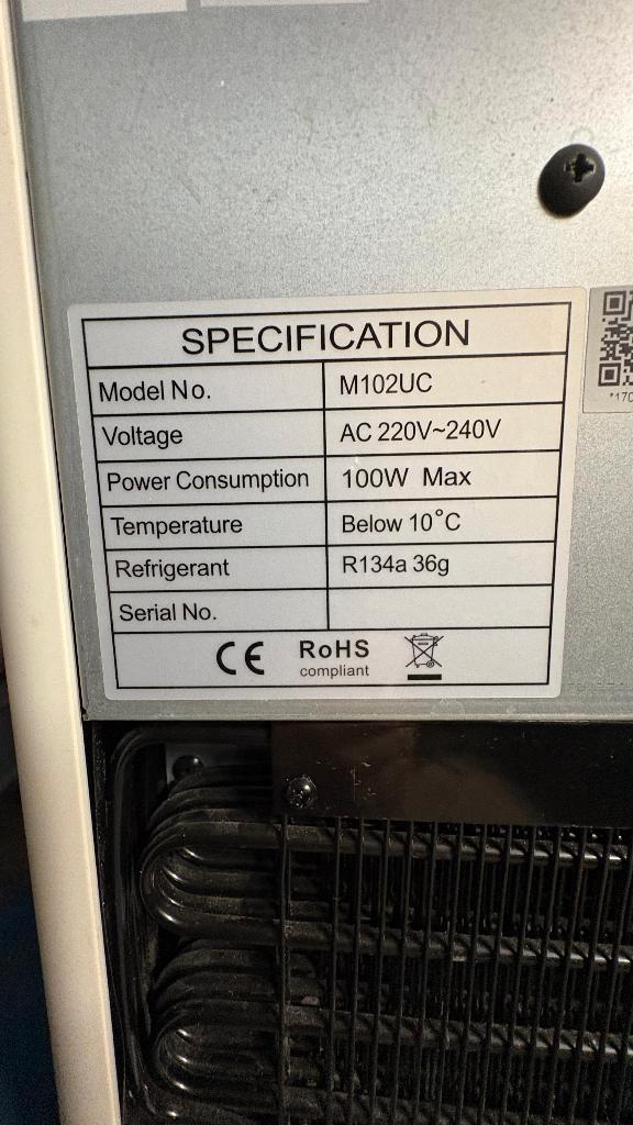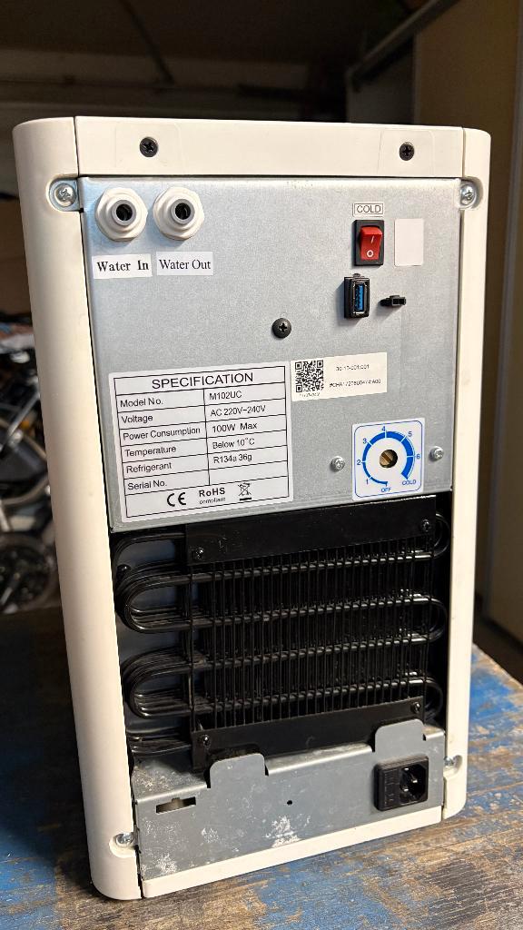 Deze floww cooler type m102uc werkt nog wel maar heeft last van lekkage aan de binnenzijde. Mogelijk nog te repareren door een specialist anders kan hij nog handig zijn voor onderdelen. Enkel af te ha