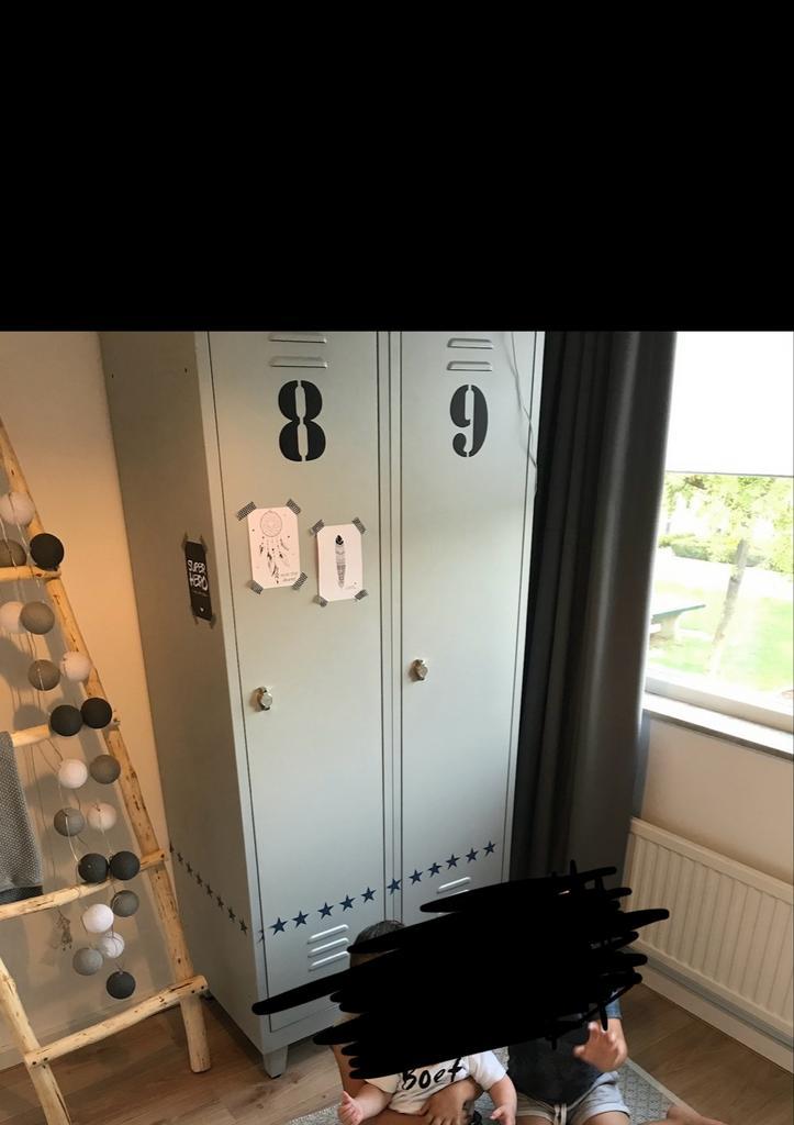 Stoere metalen lockerkast met afmetingen 180 cm hoog en 60 cm breed, staat op voetjes. Ideaal voor kinderkamer of als extra opbergruimte. De kast heeft een industriƫle uitstraling en is voorzien van d