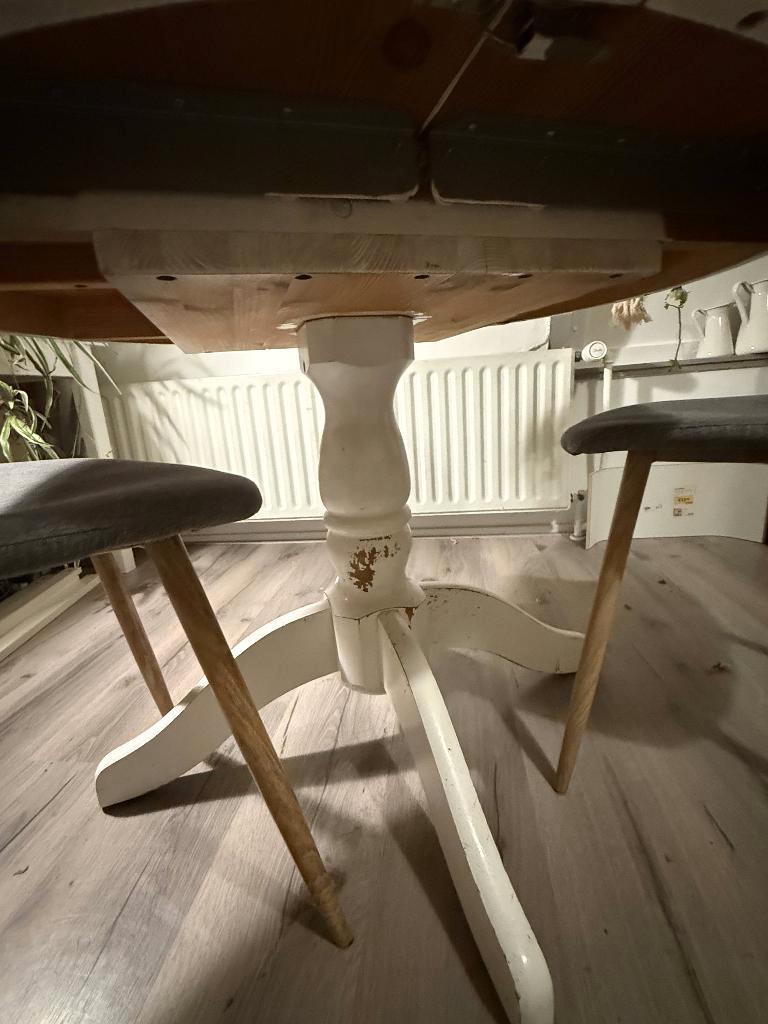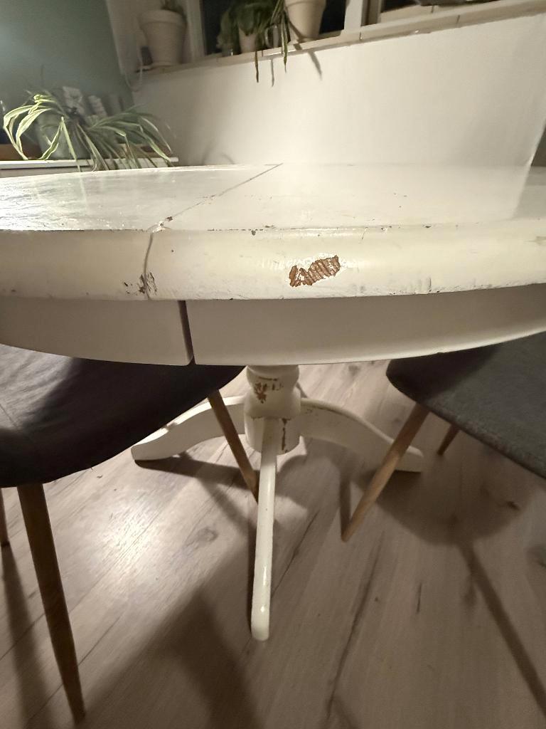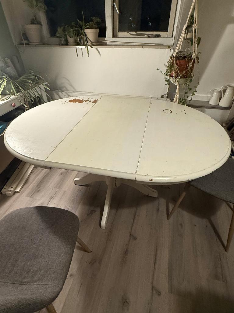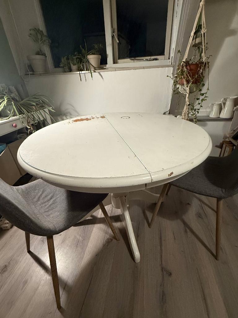 Gratis ronde houten eettafel gratis af te halen, af te halen tot en met zondag 8 febr van 2e verdieping het is een ronde tafel met los extra deel die je in het midden kan leggen, om je tafel groter te