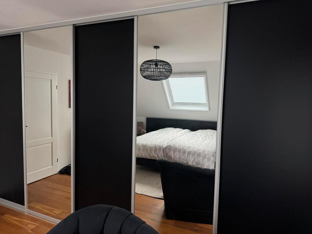 Schuifdeuren voor bijvoorbeeld een kledingkast of bijkeuken. 3X zijdeglans zwart en 2 spiegeldeuren. Profielen zijn aluminium.