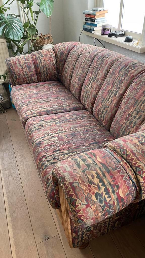 Gratis af te halen vanaf zondag 15 februari. Degelijke en stevige 2,5 zits bank met rieten details. Kan nog prima een ronde mee. Er is een kleine beschadiging op de armleuning. Indien gewenst krijg je