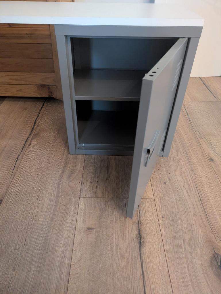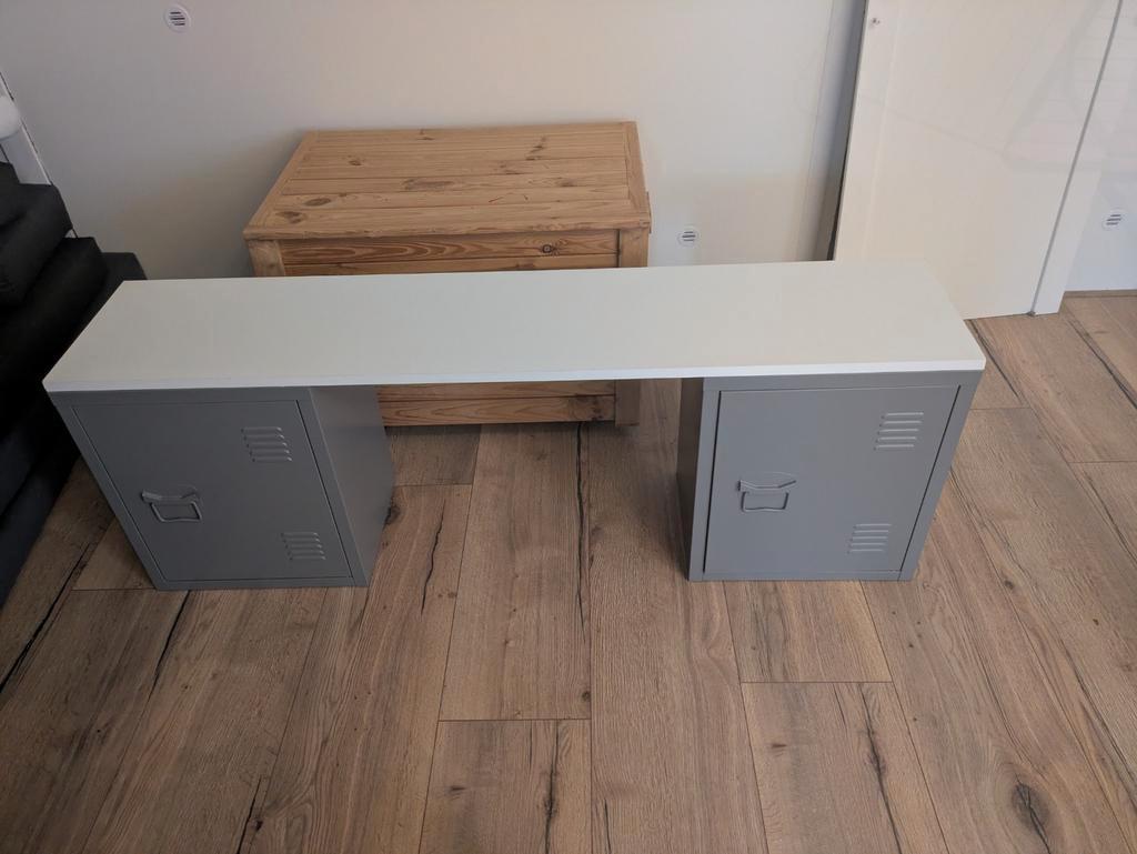 Zelfgemaakt bureautje van twee kastjes van de kwantum. Zijkant moet nog even nieuwe witte strip op, verder ziet hij er goed uit! Eventueel ook nog klein wit stoeltje erbij. Hier tot jaartje of 5 gebru