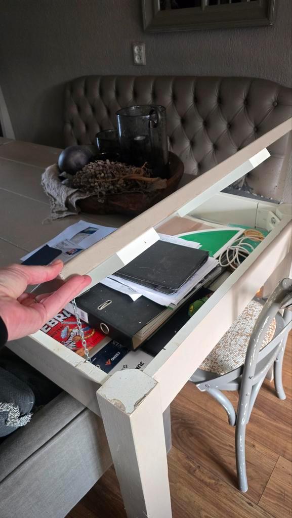 Houten tafel, 200x90 met 2 kleppen, wel verfbeurt nodig en 1 nieuw scharnier bij de kleppen, moet weg ivm levering nieuwe tafel
