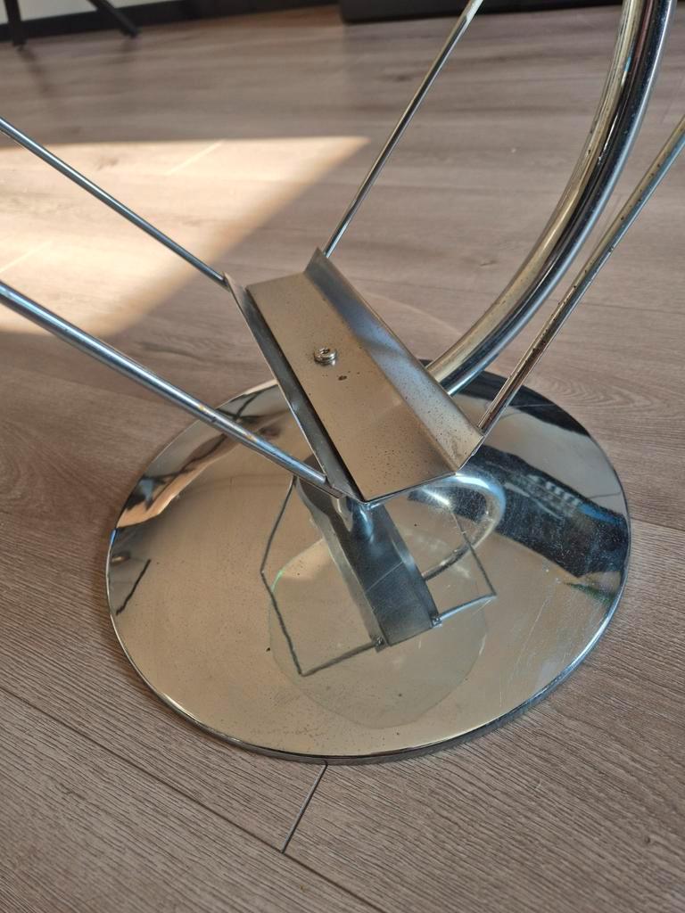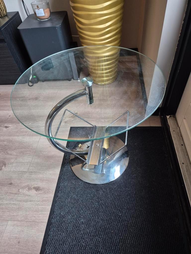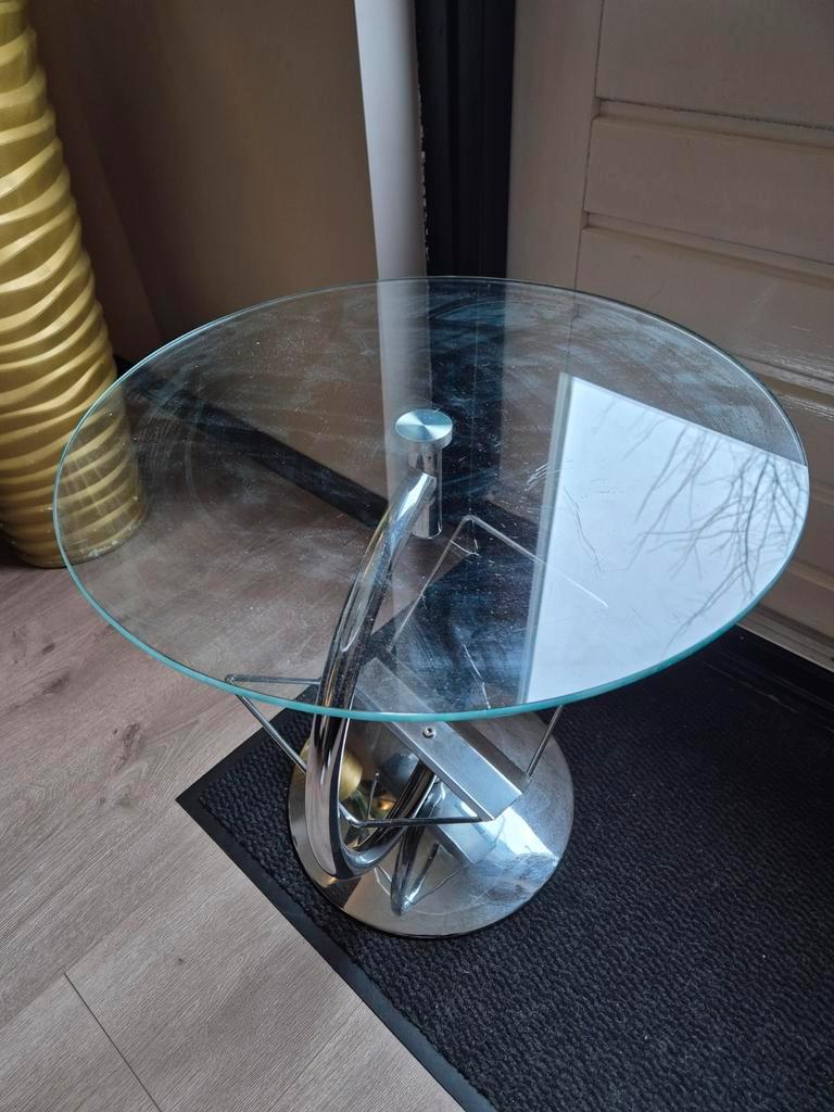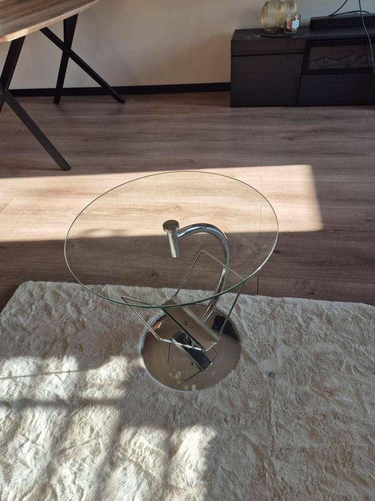 Leuk klein tafeltje, ideaal als salontafel of bijzettafel. Het tafelblad heeft een diameter van 50 cm en de hoogte is 51 cm. Gratis op te halen!