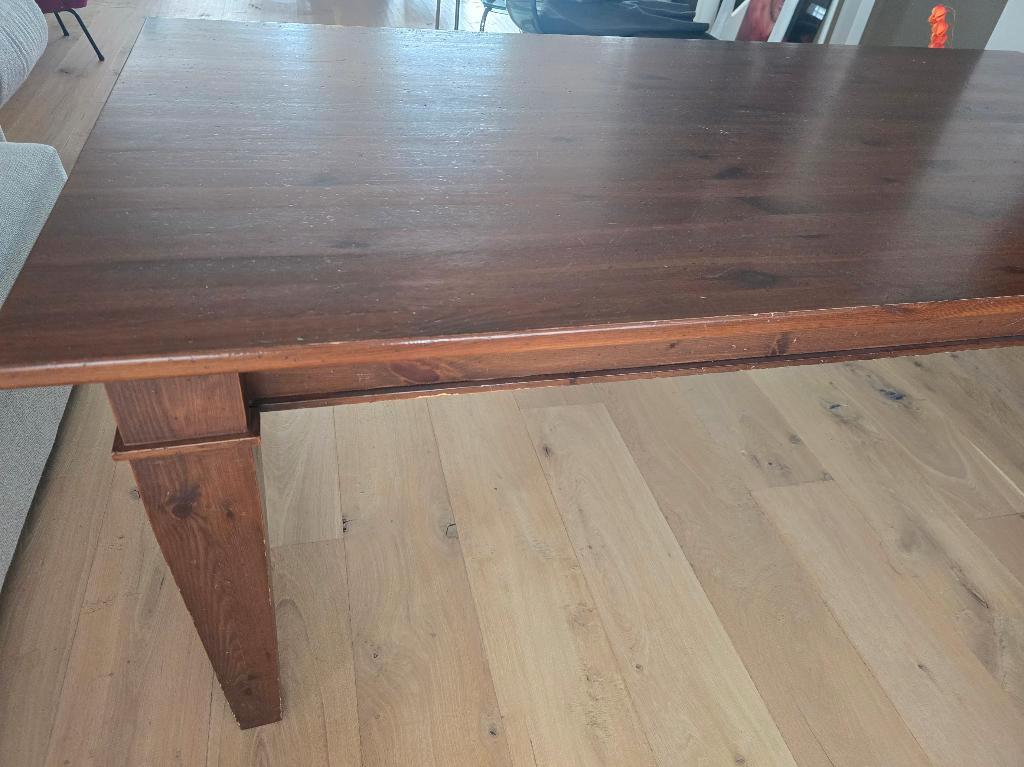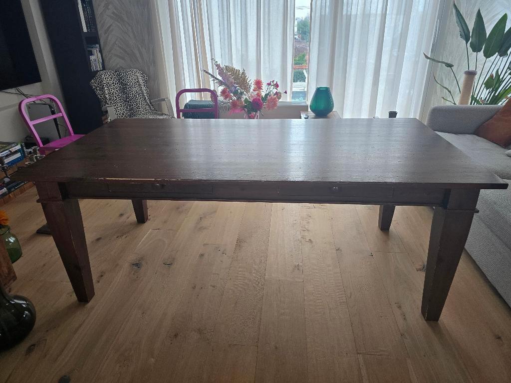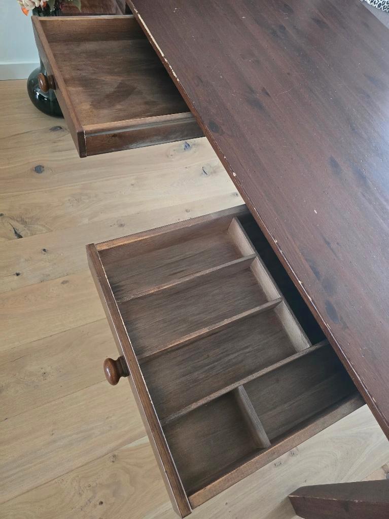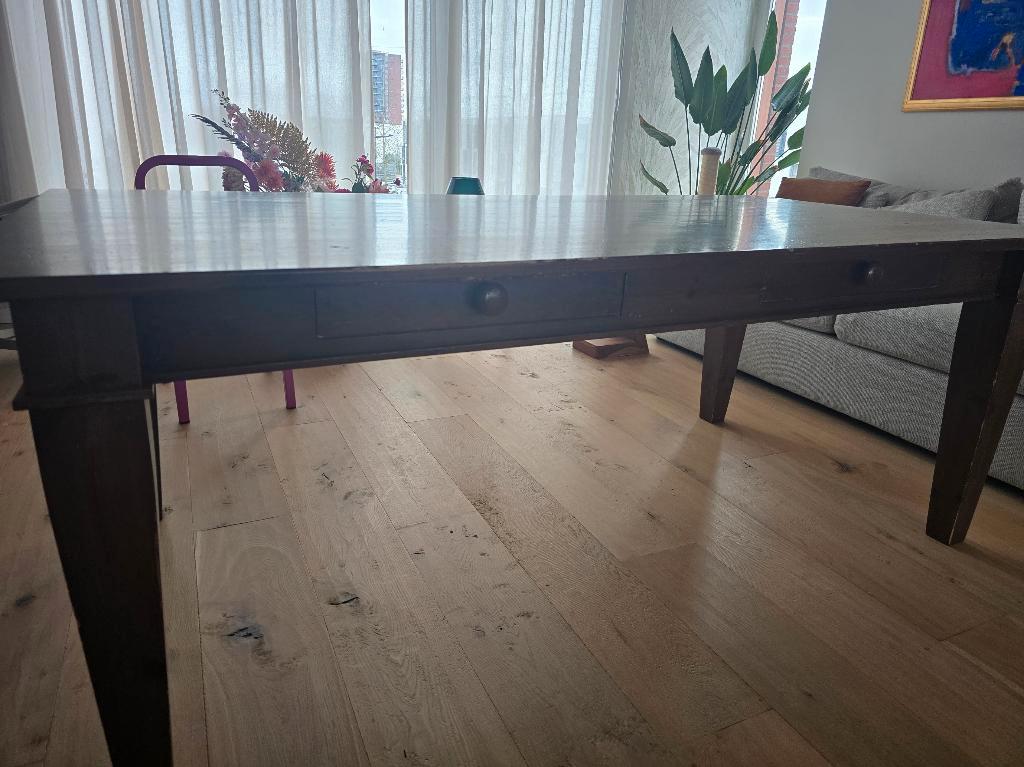 Deze houten tafel jaren geleden gekocht bij de bijenkorf. Formaat is 2 meter lang, 1,03 breed en 77 cm hoog. Er zitten 2 ruime laden in, waarvan 1 lade een bestek-indeling heeft. Zoals je ziet heeft d