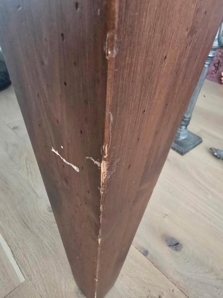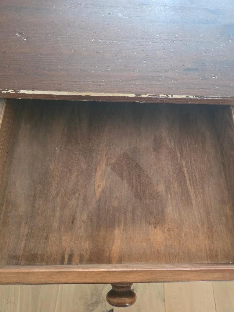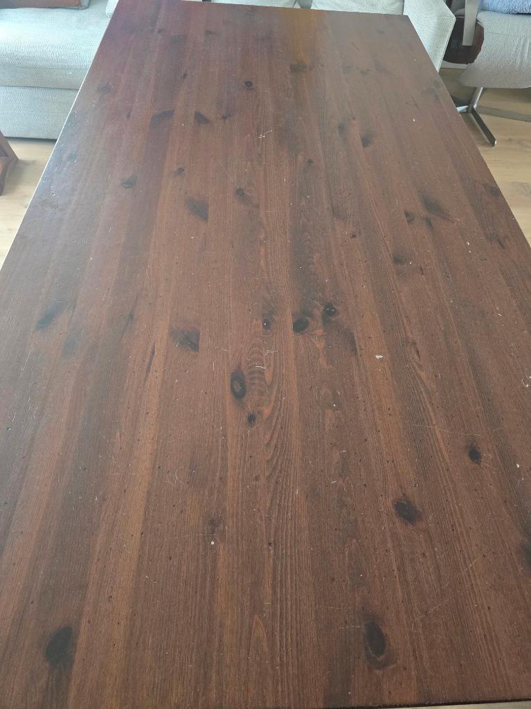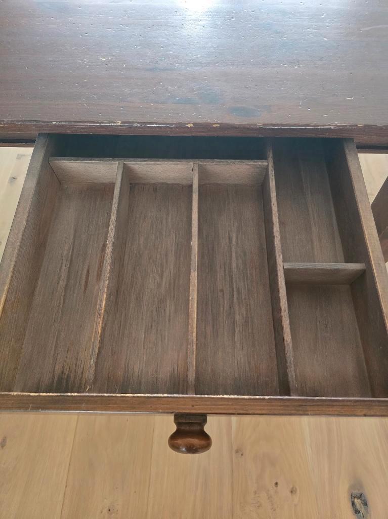 Deze houten tafel jaren geleden gekocht bij de bijenkorf. Formaat is 2 meter lang, 1,03 breed en 77 cm hoog. Er zitten 2 ruime laden in, waarvan 1 lade een bestek-indeling heeft. Zoals je ziet heeft d