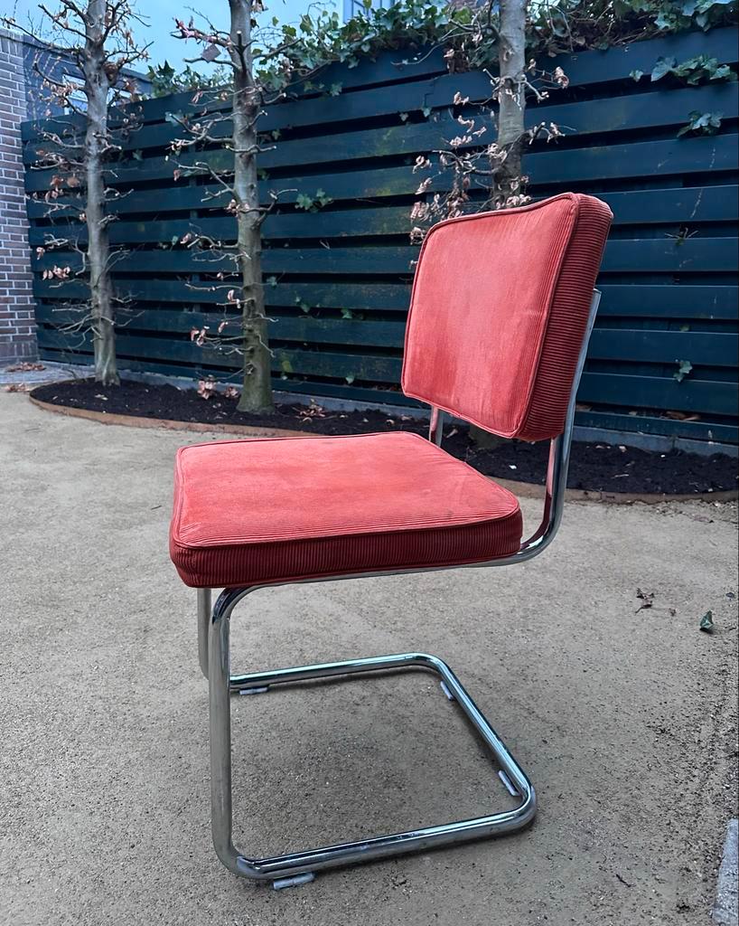 Set van 6 gebruikte eettafelstoelen met een oranje ribstof bekleding. De stoelen zijn gratis op te halen.