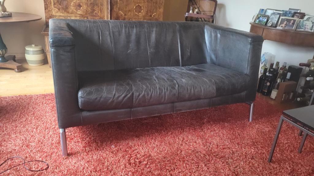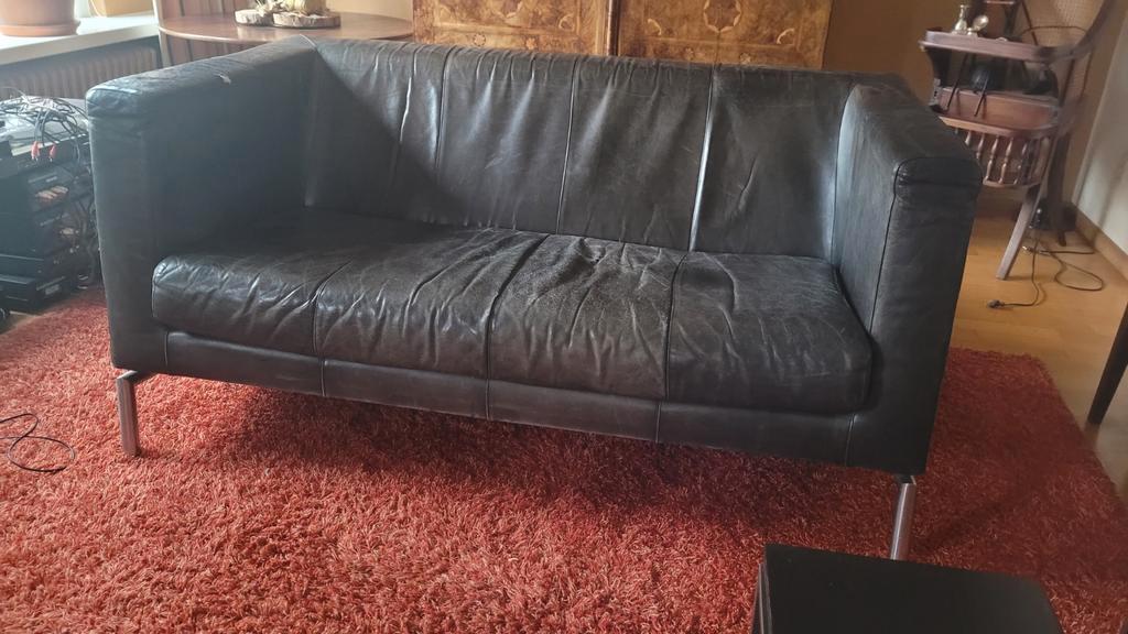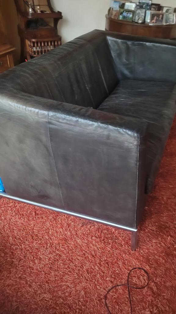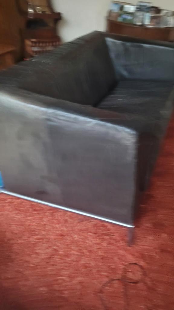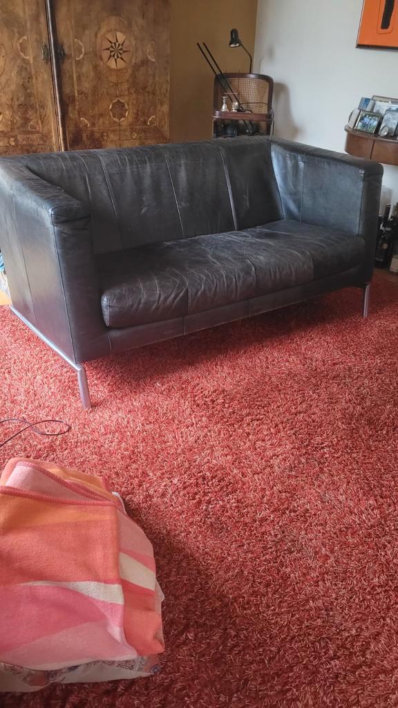 Ruime 2-zits bank van harvink met z.v.s. Poten. Lxbxh zijn 150 x 80x 72 cm zwart leer. De conditie is gebruikt.