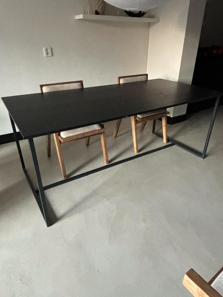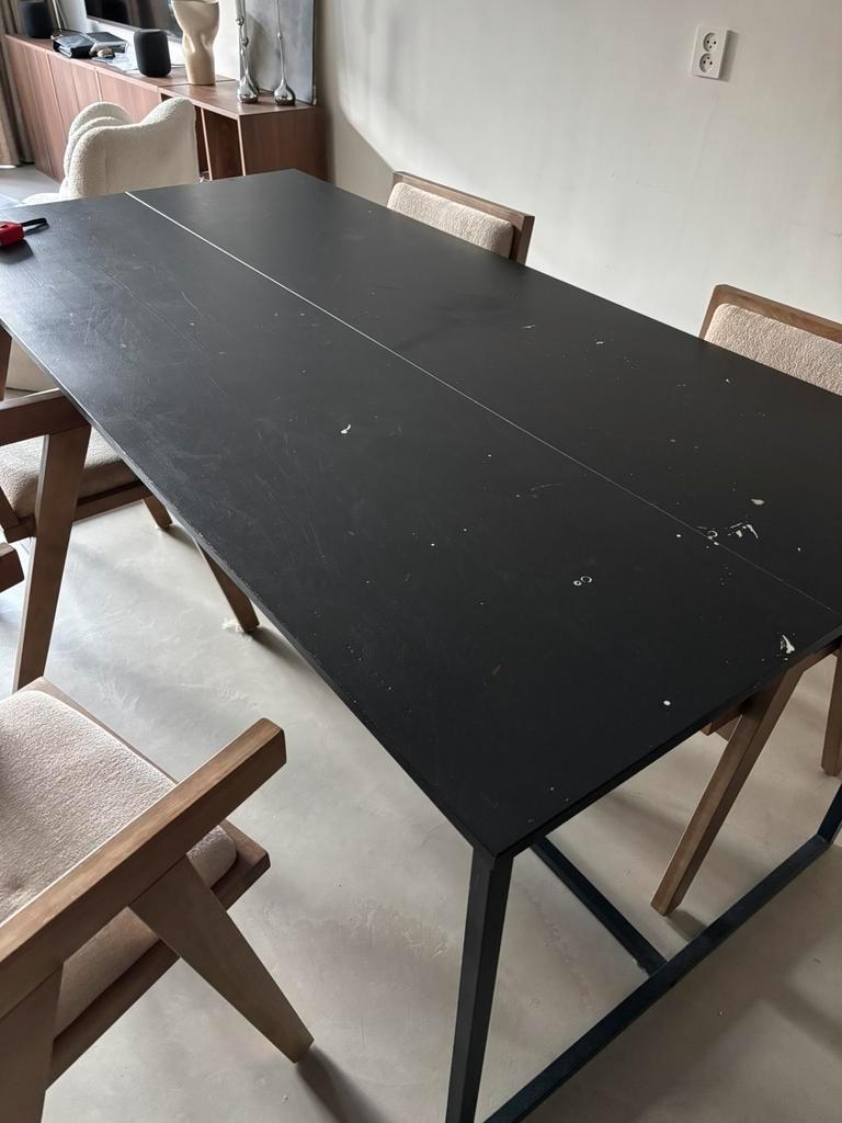 Eettafel zwart met metalen frame. 185X90x75 cm het tafelblad is al gedemonteerd. Het frame kan niet uit elkaar. Het blad kan wat liefde gebruiken. Is veel als werkbank gebruikt.