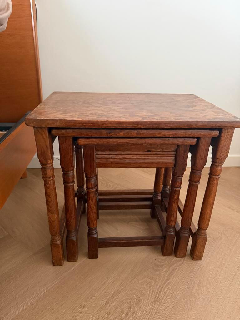 Een mooie set van 3 vintage bijzettafels. De tafels zijn gemaakt van hout en hebben een vierkante vorm. Ze zijn in gebruikte staat, maar nog steeds erg stevig en functioneel. Ideaal voor een vintage o