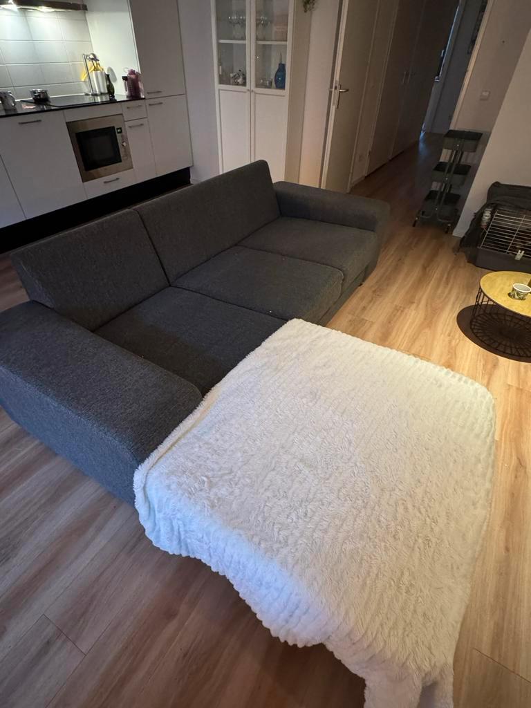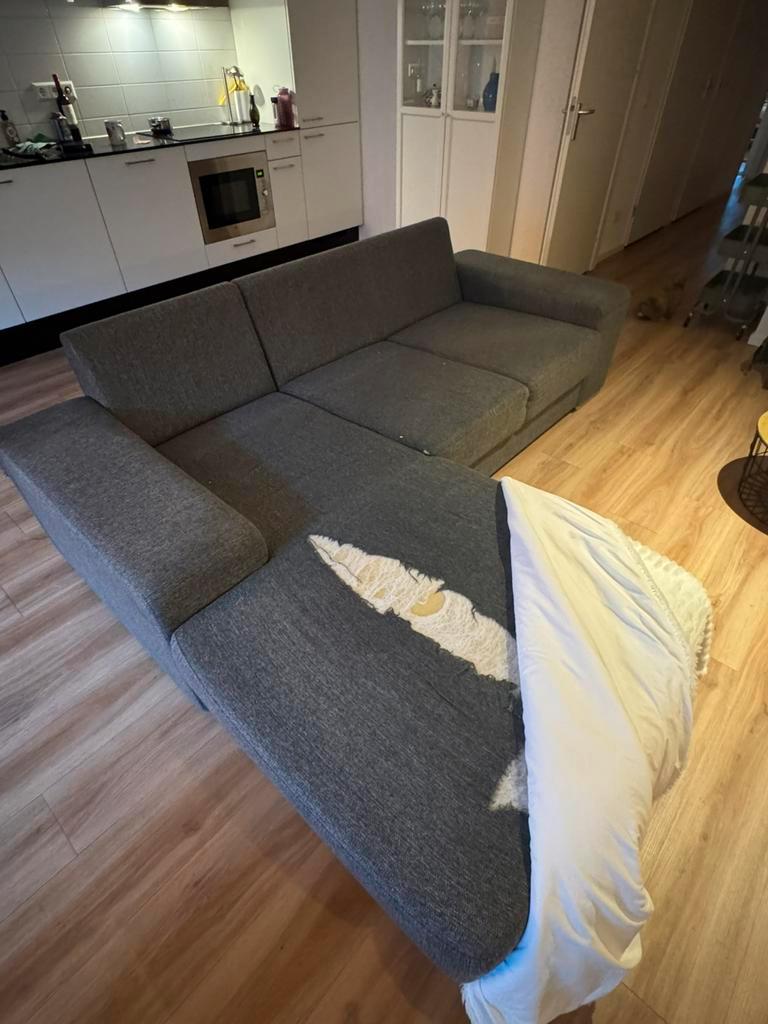 Gratis bank! Wegens verhuizing moet deze zo snel mogelijk weg. De bank heeft een gat in het liggedeelte en beschadiging aan de zijkant (zie foto''s). Er zijn nog drie rugkussens aanwezig.