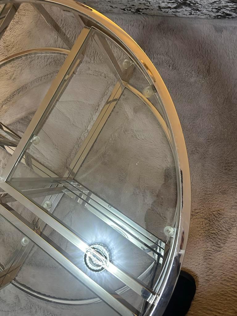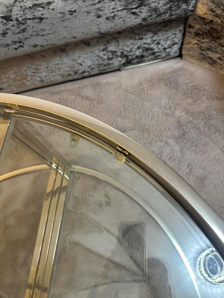 Mooie ronde salontafel met een diameter van 94 cm. De tafel is uittrekbaar, waardoor extra tafelruimte gecreëerd kan worden. Het glazen blad heeft een metalen frame. Let op: 1 kant van het glas is iet