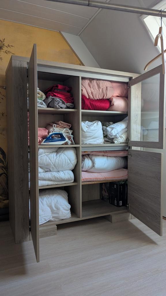 Zo goed als nieuwe kledingkast te koop! Afmetingen: hoogte 159 cm, lengte 136 cm, diepte 52 cm. De kast is in uitstekende staat en biedt veel opbergruimte. Ophalen in zevenhuizen zh