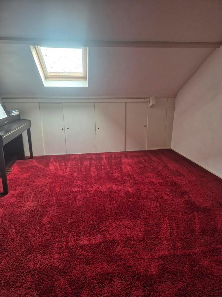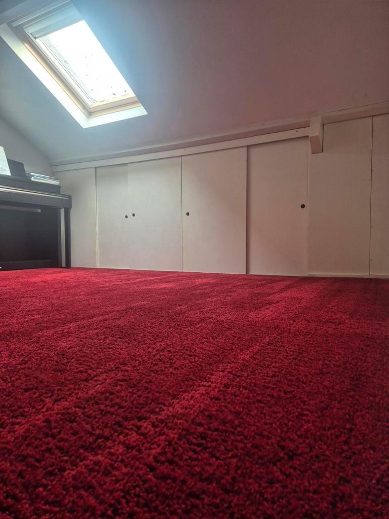 Gratis afhalen: 15m2 rood tapijt, met middelmatig hoge pool, inclusief vilten ondervloer. Rechthoekig gesneden formaat van 3 meter bij 5 meter. Vloerbedekking heeft bij ons op zolder gelegen, die alle