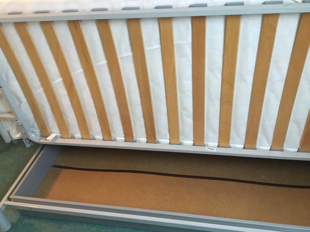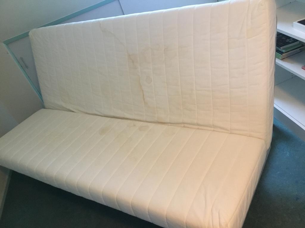 Slaapbank ikea. Merk beddinge. Wit. 210 X 150 cm. Met overtrek en grote onderschuifla.het overtrek ziet er zeer goed uit. De matras zelf heeft wat zweetvlekken (zie ook de foto’s). Het uitgeklapte bed