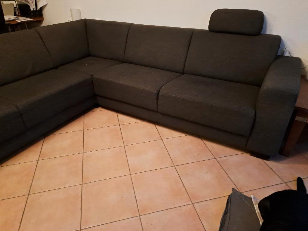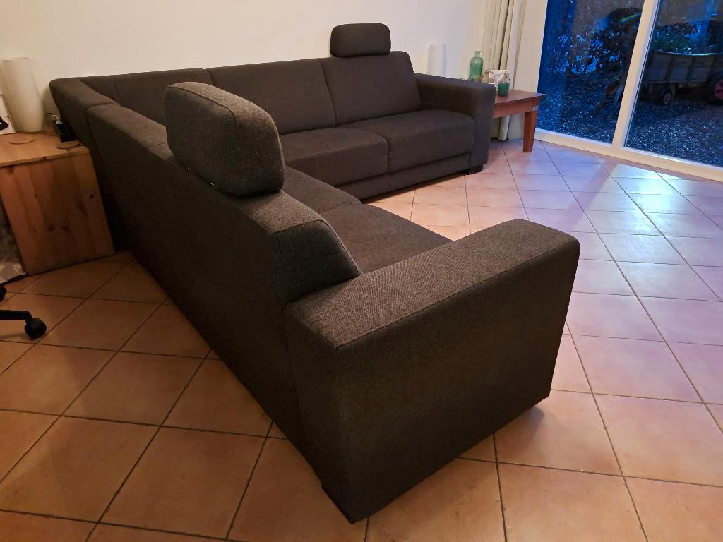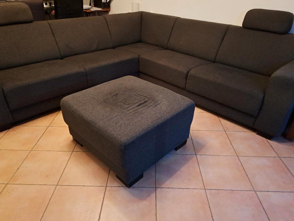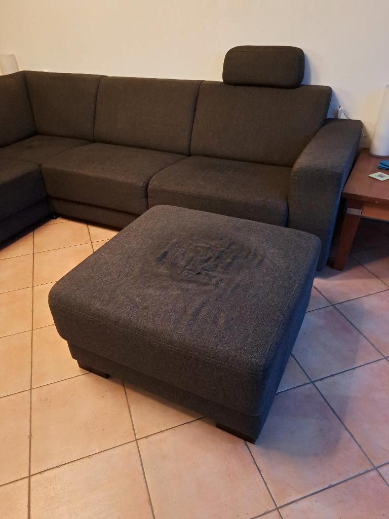 Gratis af te halen: hoekbank met hocker. Geschikt voor 5 tot 6 personen. Gemaakt van stof. De bank is gebruikt, maar nog in redelijke staat. Vooral beschadigd in de hoek (zie foto''s). Maar met een