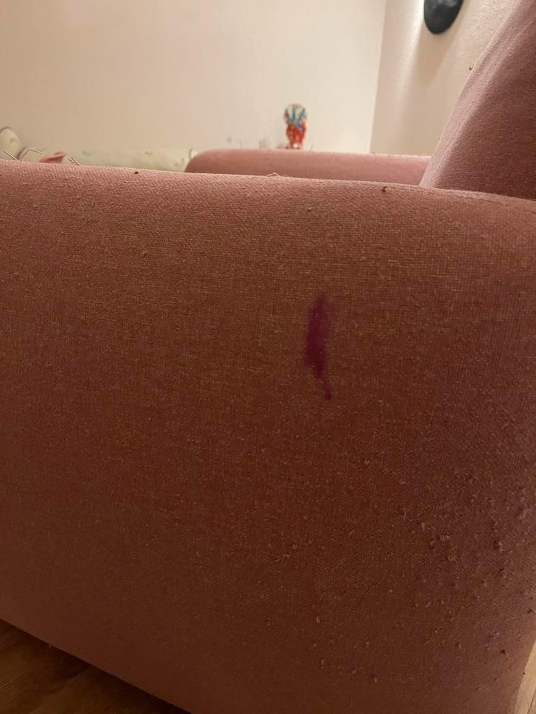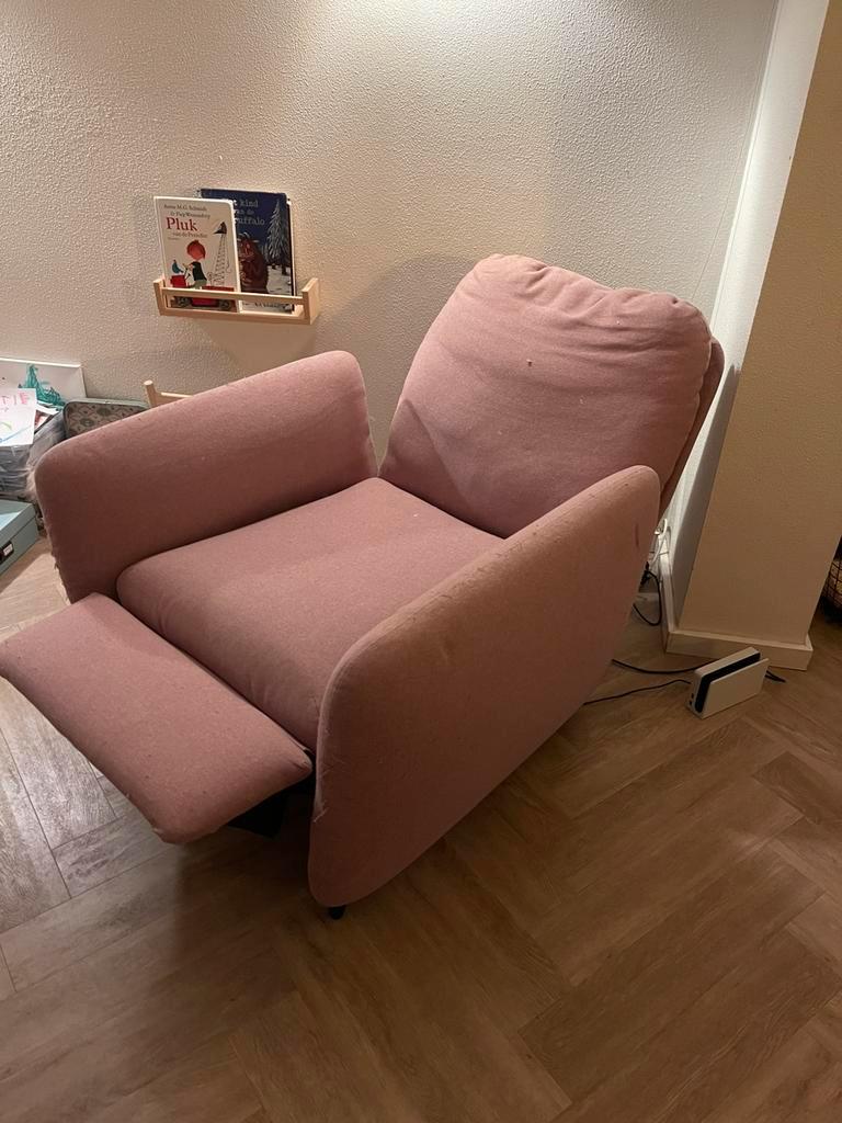 Oud roze ikea ekolsund relax fauteuil. Katten hebben de stoel op bepaalde plekken onder handen genomen, en kinderen hebben erop getekend. Gratis ophalen