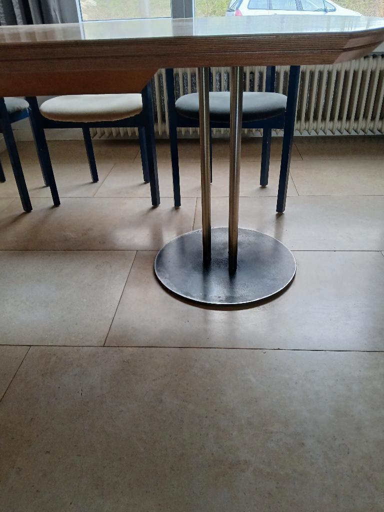 Bijzondere eettafel gratis af te halen in heerlen , zuid limburg. Bladmaat 90 x 180, te vergroten tot 90 x 250 cm. Hoogte 75 cm. Tafel is loodzwaar, kan in drie delen uit elkaar: dubbel blad, metalen