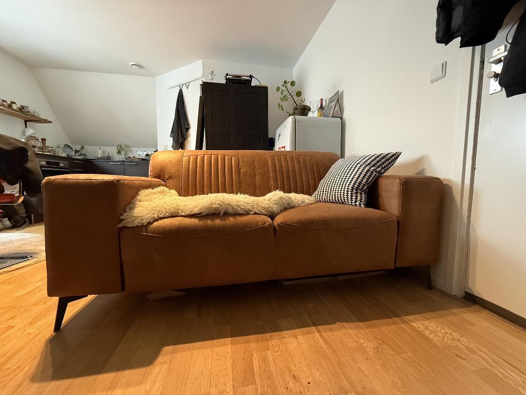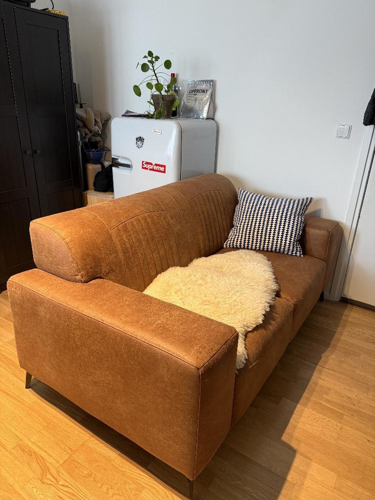 Leren bank in nieuwe staat. Gaat weg wegens aanschaf ander type bank. Komt uit een rook- en huisdiervrij huis. Moet wel uit elkaar gehaald worden (3 onderdelen) om naar beneden te kunnen. Help ik graa