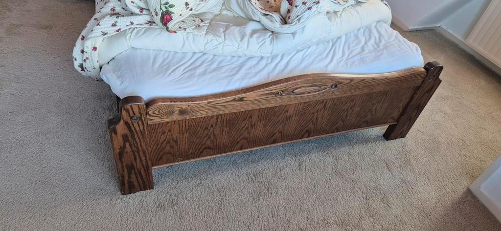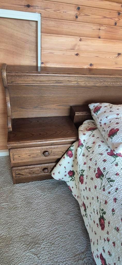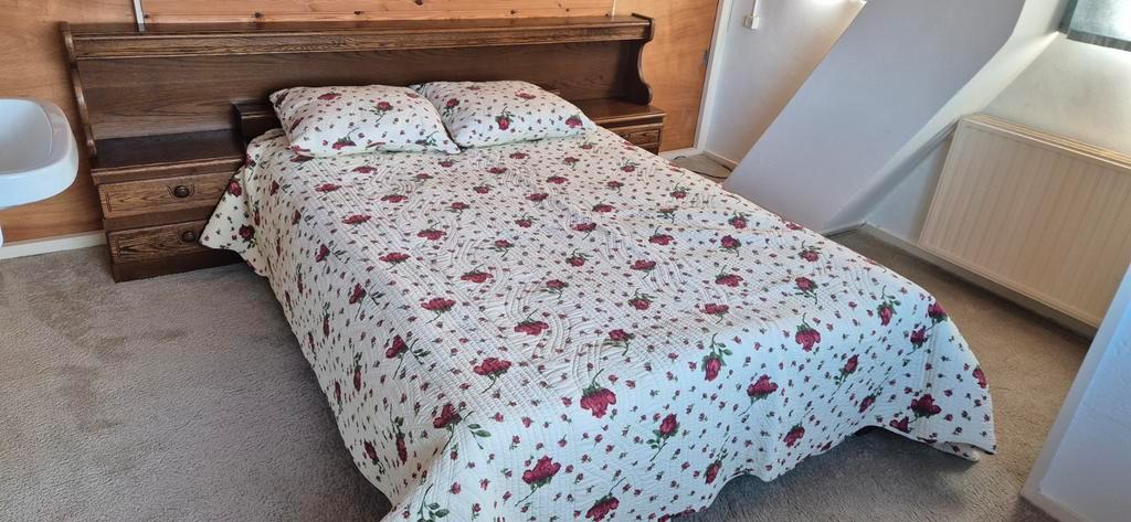 Stevig en stijlvol eikenhouten bedframe. Geschikt voor een comfortabele nachtrust. Het bedframe is in goede staat en heeft een warme uitstraling. Perfect voor een klassieke of landelijke slaapkamer. A