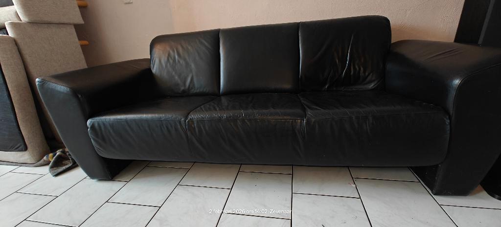 Mooie lederen bank met gebruikssporen. Leer is niet beschadigd maar aan de rechterkant enigszins geplooid doordat er op die plaats regelmatig is gezeten.