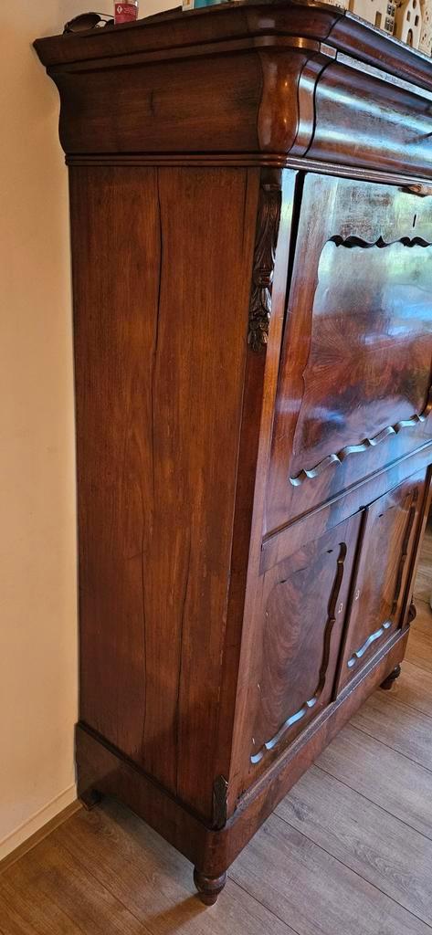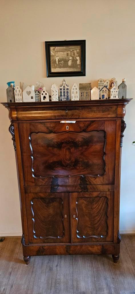 Klepsecretaire kast met een klein beetje werk (slotje klep werkt niet optimaal en vilt op de klep mist) 156 cm hoog, 105 cm breed, 48 cm diep de reeks van 19 boeken (reader’s digest- het beste boek),