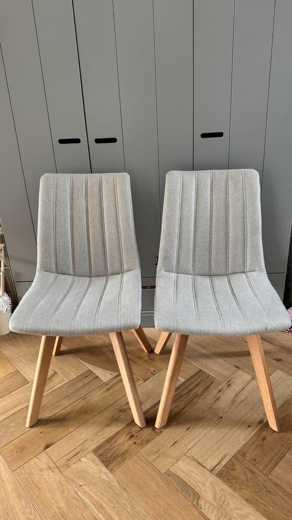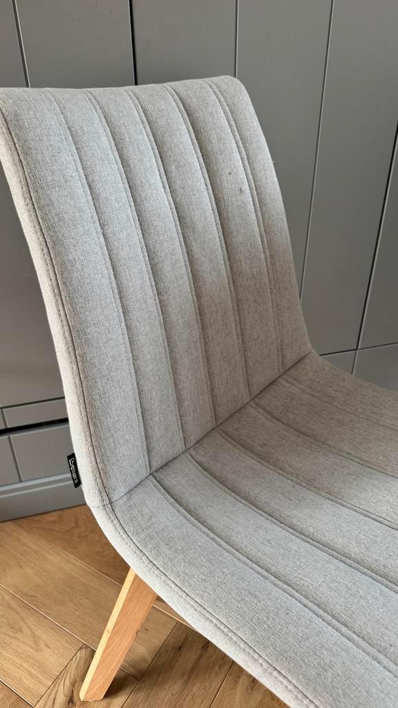 Gratis af te halen. 2X stoel met grijze stoffen bekleding en houten poten. Merk belliani.