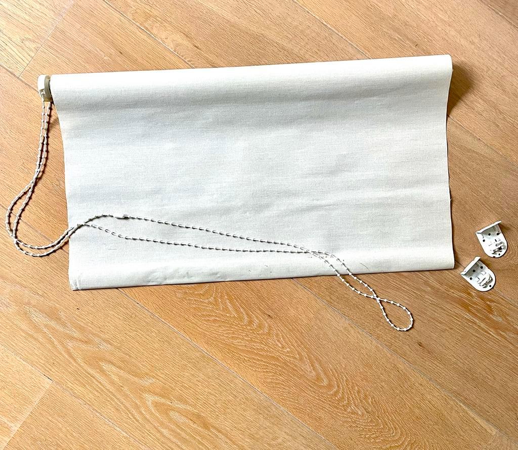 Rolgordijn, doek is 65 cm breed, voor kozijn van plm 72 cm binnenmaat. Lengte 2 meter. Kleur beige. Gratis af te halen.