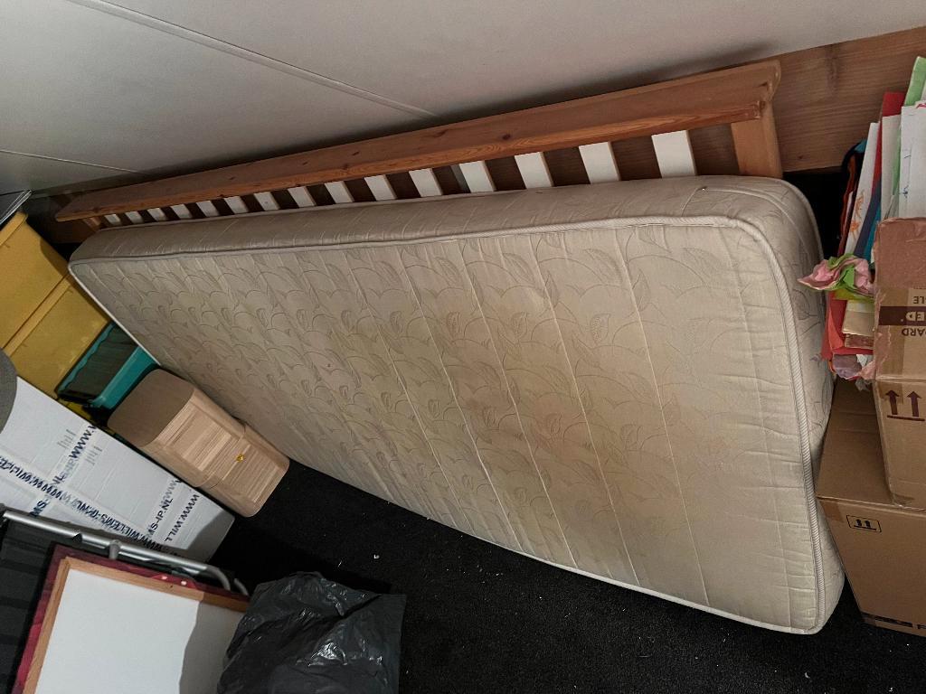 1 persoons bed 200 x 90 cm, grenenhouten frame (goed te schilderen), degelijk en in goede conditie, compleet met bevestigingsmaterialen en matras