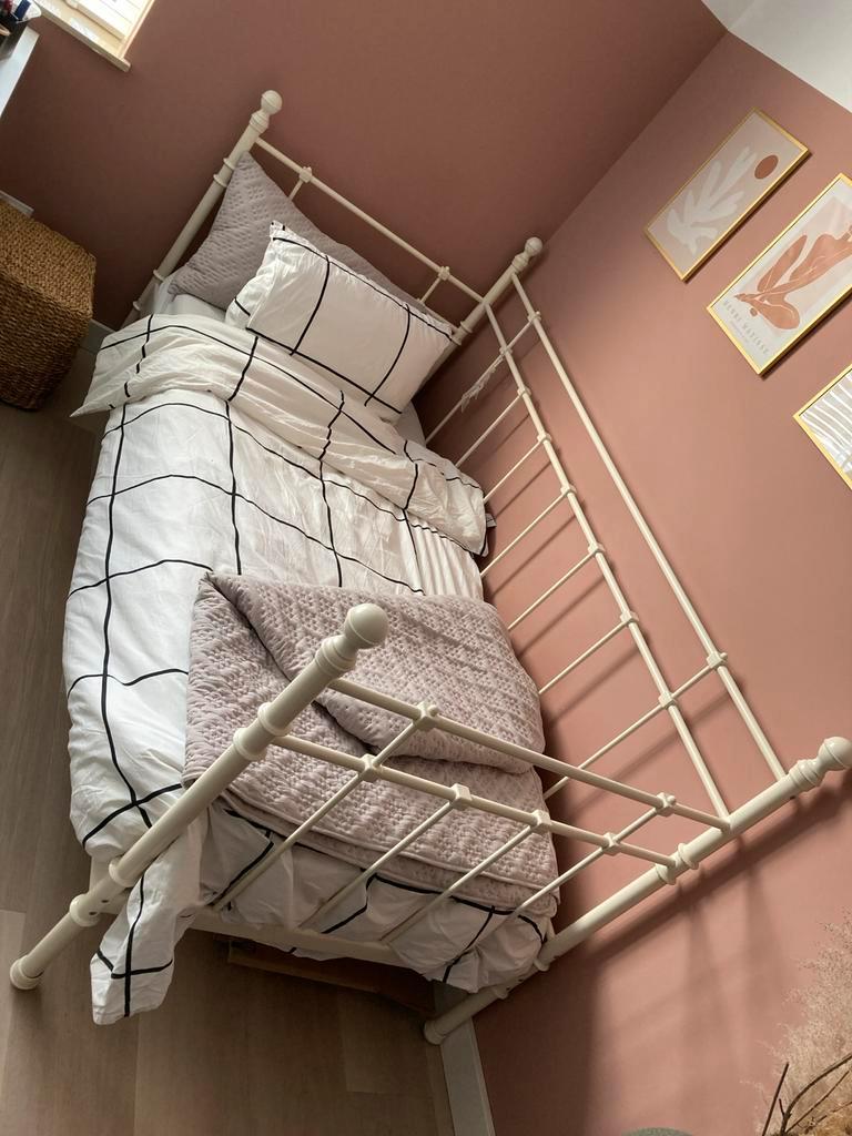 Een fijn eenpersoonsbed met een afmeting van 90x200 cm. Het bed wordt geleverd inclusief een comfortabel matras en een boss spiraalbodem voor goede ondersteuning. Ideaal voor een studentenkamer, kinde
