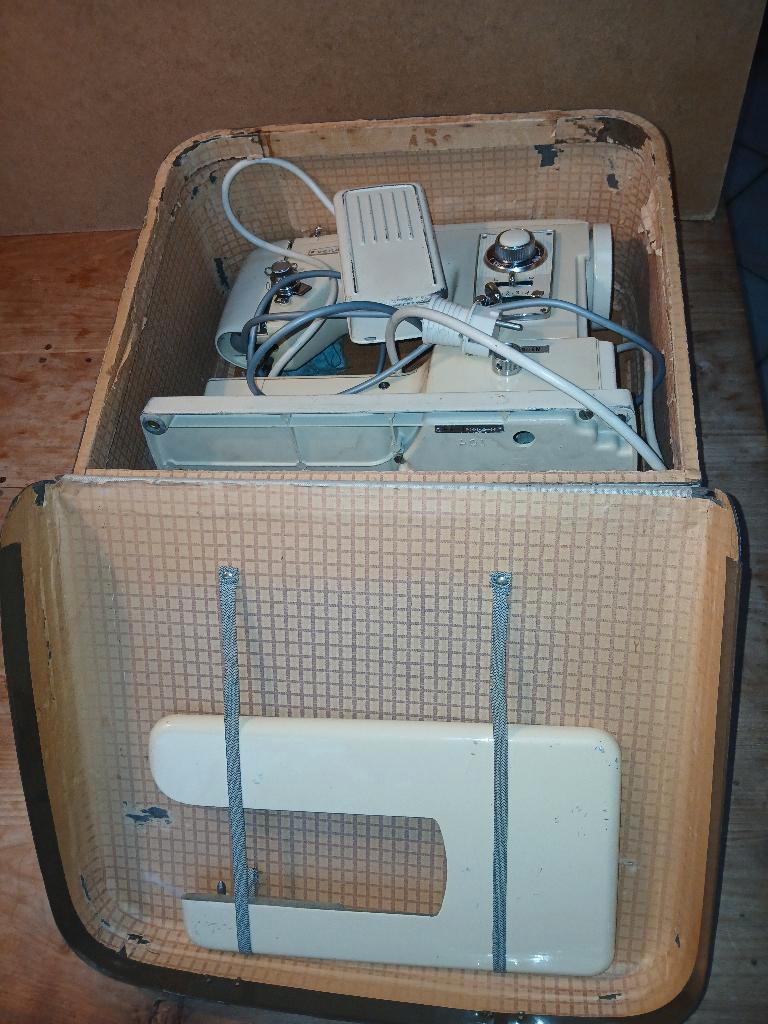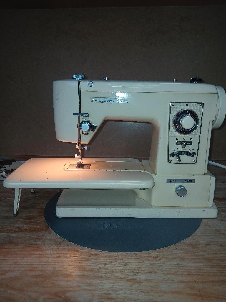 Vendomatic naaimachine b775 hij doet wel iets maar niet goed. Er moet een kenner naar kijken, of het is interessant voor onderdelen. Met koffer met pedaal met diverse hulpstukken helaas zonder gebruik