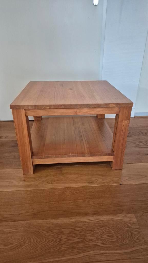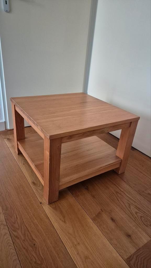 Gebruikt, maar solide salontafeltje. Afmetingen zijn 60 x 60 cm en 42 cm hoog.