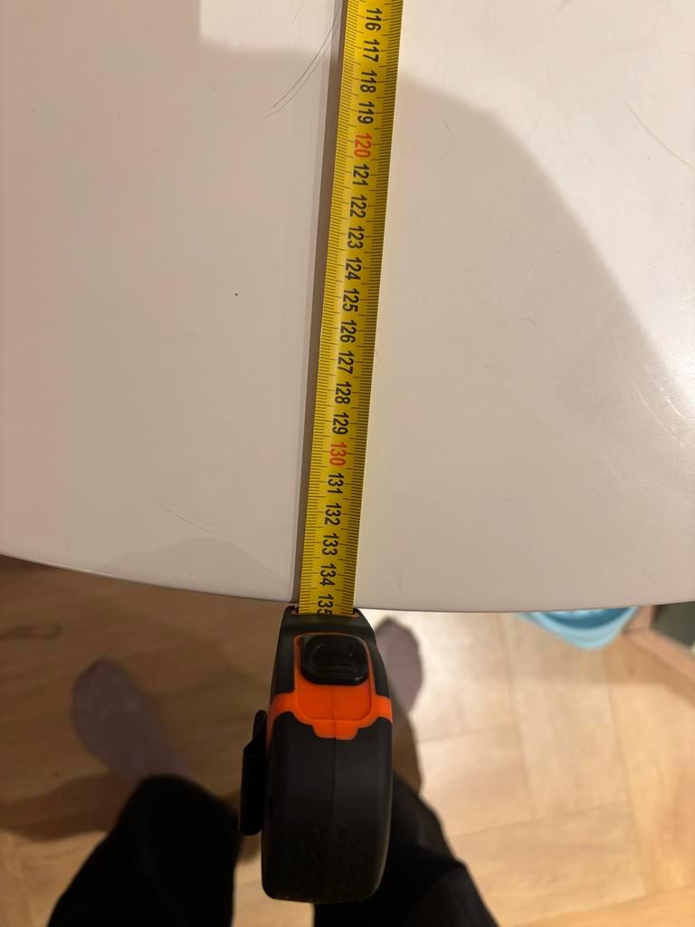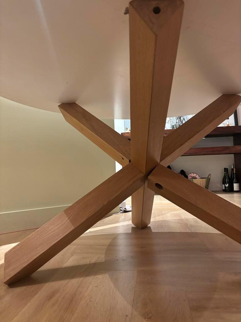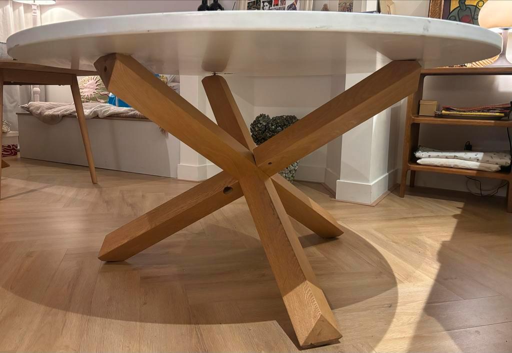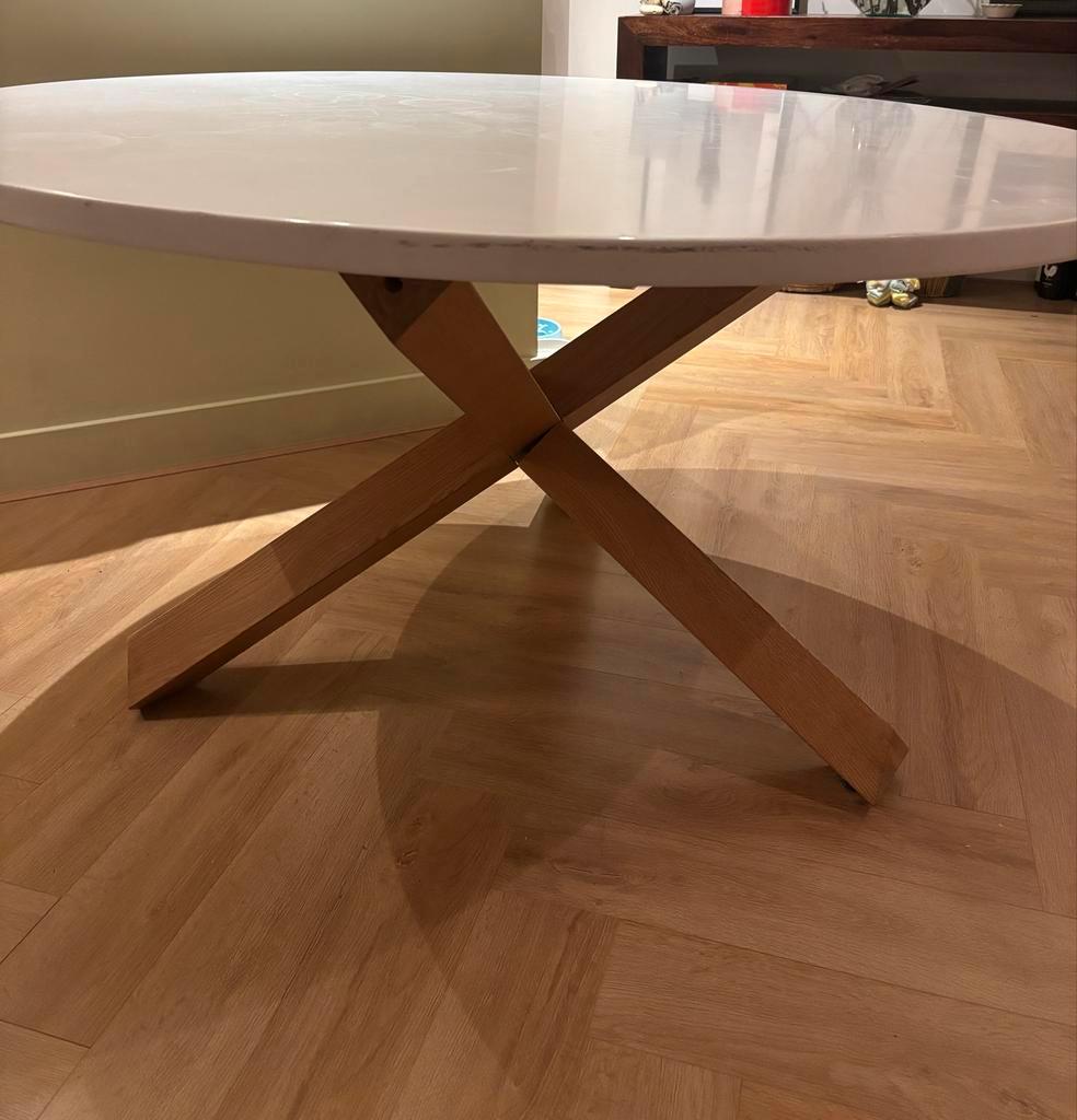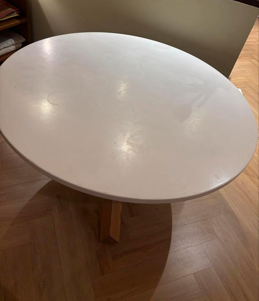 Eettafel lotus. Mooie ronde tafel met een diameter van 135 cm. De tafel is wankel en het blad ligt er niet goed op maar wel te fiksen als je handig bent.