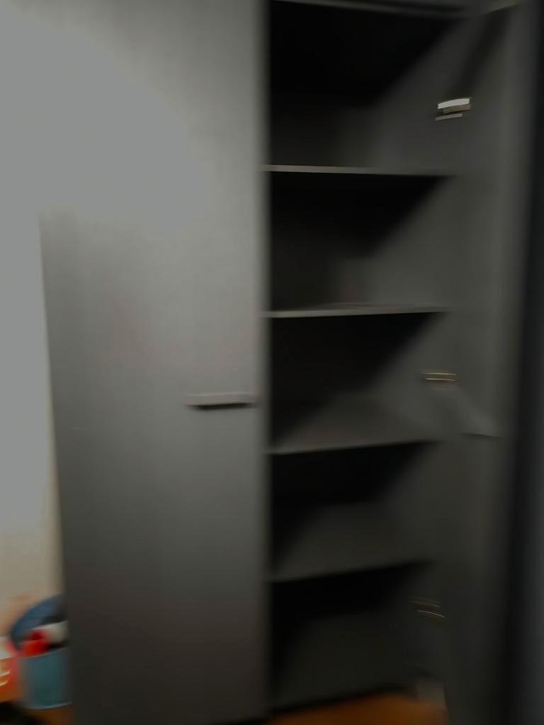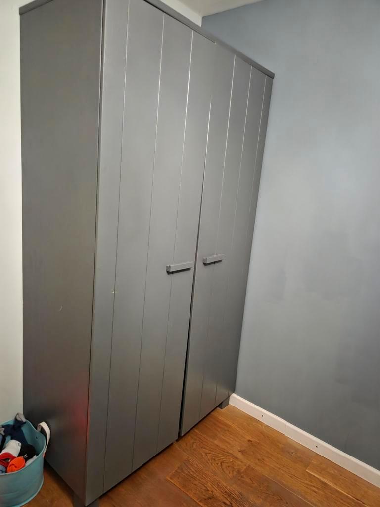 Mooie houten kledingkast van woood met deuren en planken. Ideaal voor het opbergen van kleding en andere spullen. De kast is in goede staat en heeft een tijdloze uitstraling. Deur van de kast hangt sc