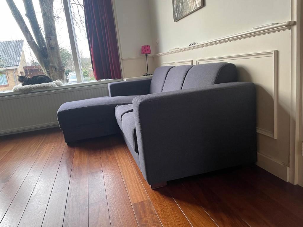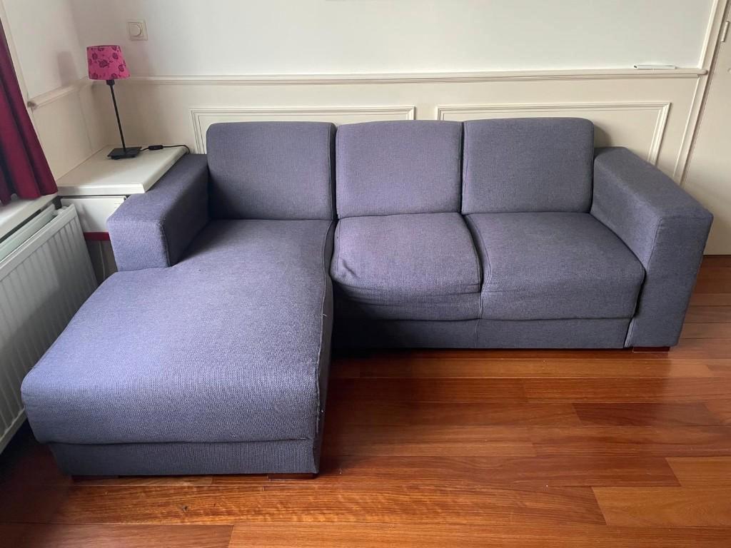 Gestoffeerde grijs-blauwe 3 zits bank 210b x 73h x 80d, longchair 143d. Is makkelijk uitneembaar in 2 delen tbv. Vervoer.