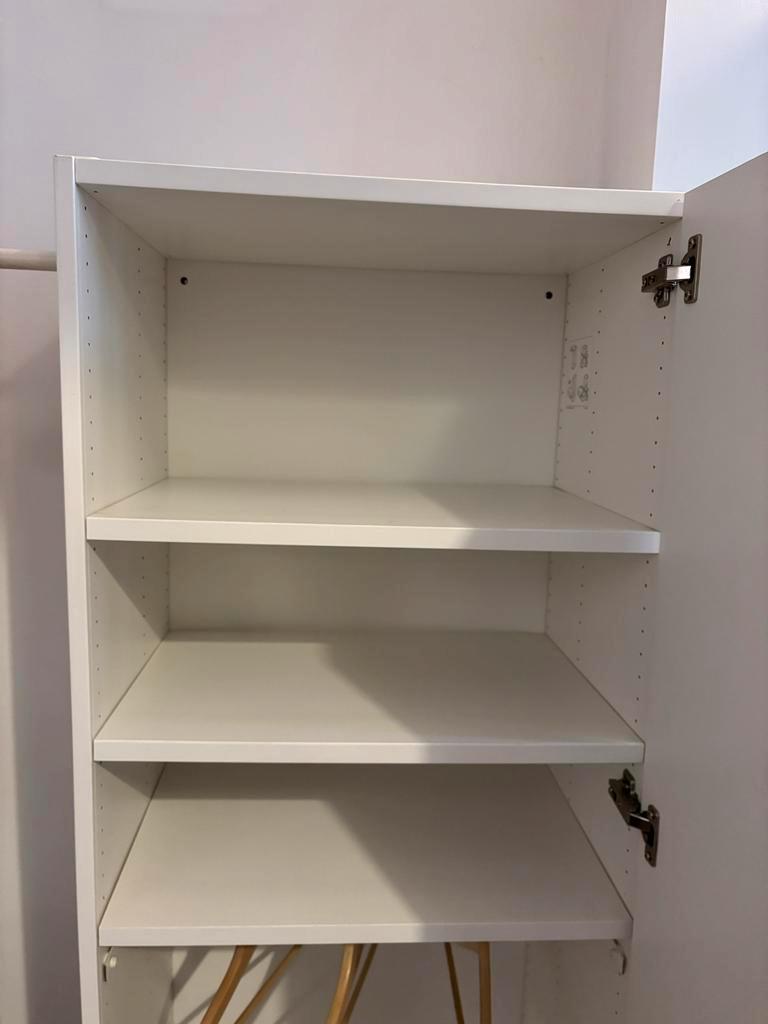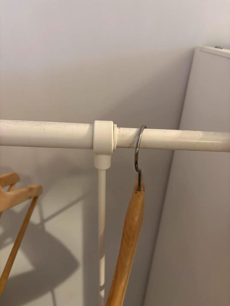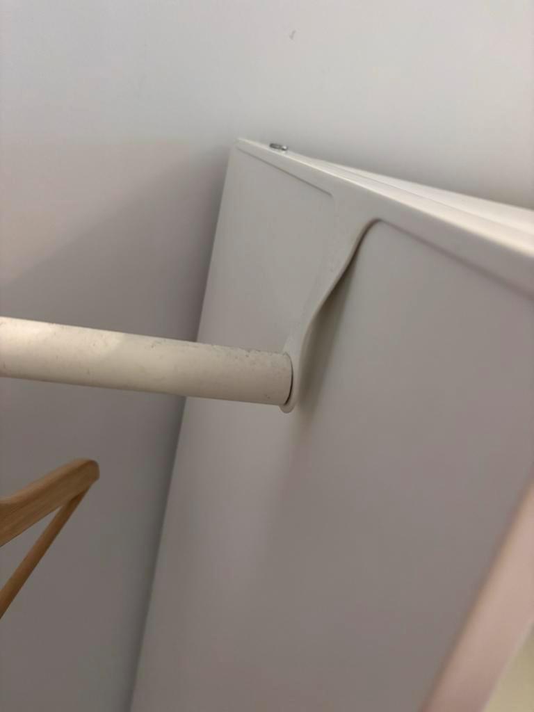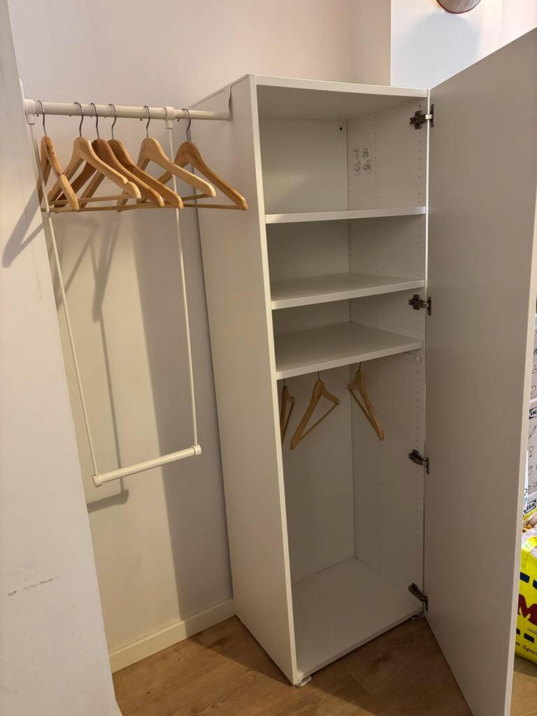Ikea kledingkast mag gratis weg vanwege verhuizing! De stang aan de muur is verstelbaar en kan zowel rechts als links van de kast hangen, of er helemaal afgelaten worden. Er is ook een stang in de kas