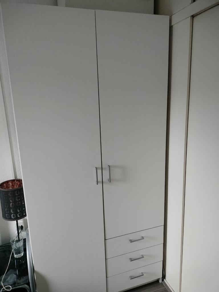 Witte kledingkast in goede staat. 1 Gedeelte om kleding op te hangen en 1 gedeelte planken om kleding op te leggen inclusief laatjes stuur evt een berichtje voor foto''s aan de binnenkant. Ligt op