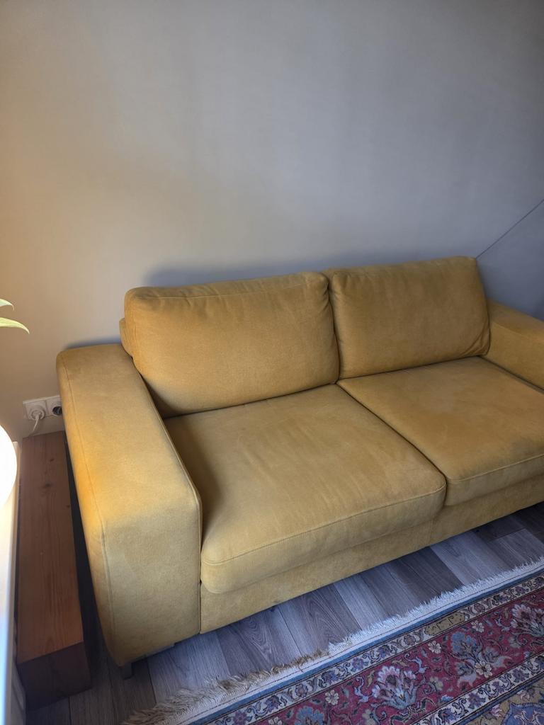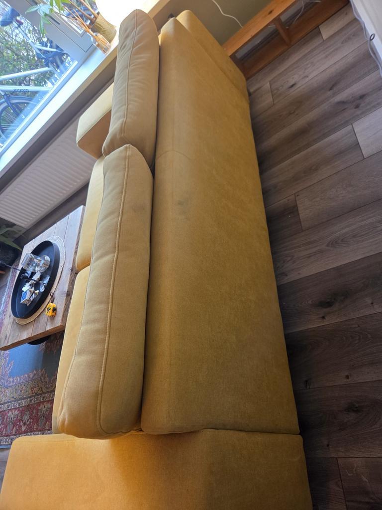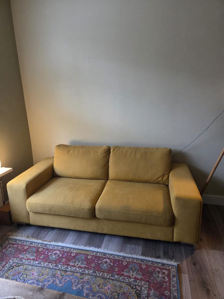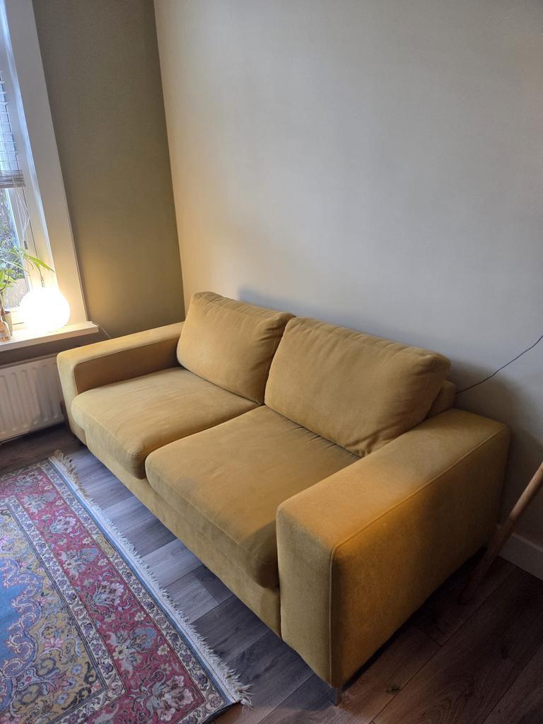 Fijn okergeel tweezits bankje te koop, jaren met veel plezier gebruikt. Wat kleine slijtageplekken op de stof maar kwalitatief nog in goede staat. Comfortabel en stijlvol, perfect voor een kleine woon